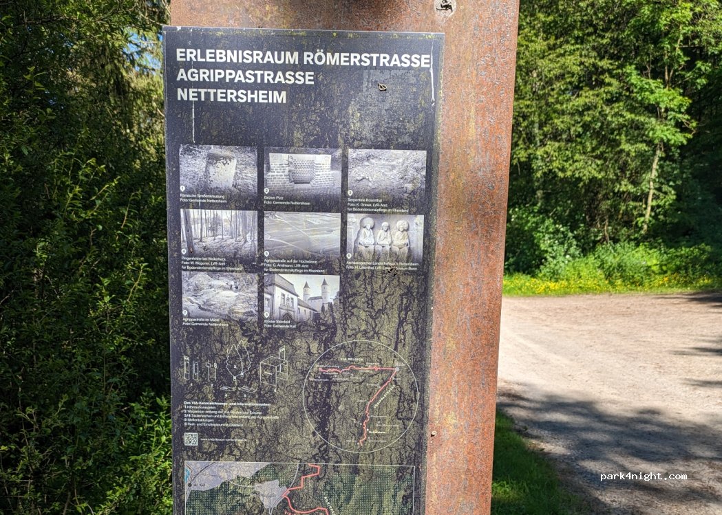 Auf der Hälfte der Zuwegung kommt ein Schild Durchfahrt Verboten mit dem Zusatz für Besucher der römischen Wasserleitung frei. Der Parkplatz befindet sich direkt an der Wasserleitung.