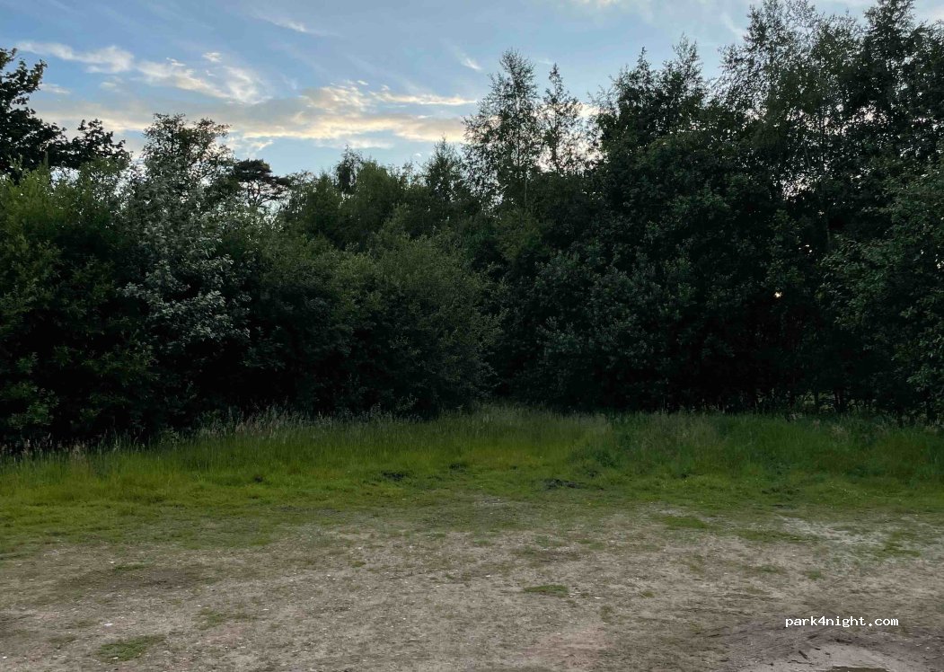 Parked on grass. An undisturbed night with some noise from the nearby highway. Good dog walking opportunity from the parking. Glass recycling station, no bins.