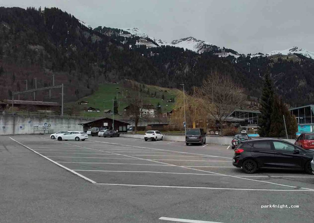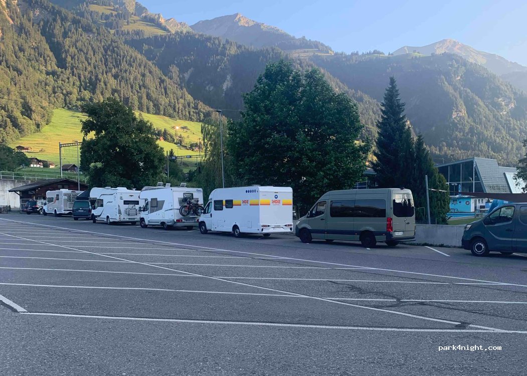 Camping complet monsieur au téléphone très gentil et m'a dit qu'on pouvait dormir sur le parking pour 30CHF/ nuit (un peu cher mais fait affaire) WC à disposition proche piscine et accueil piscine ouvert jusque 21h avec accès toilettes et douches pour 4CHF/ pers. Un peu de bruit jusqu'à 23h et le matin certains mettent leur bouteilles de verre de bonne heure mais la vue nous fais oublier cela.