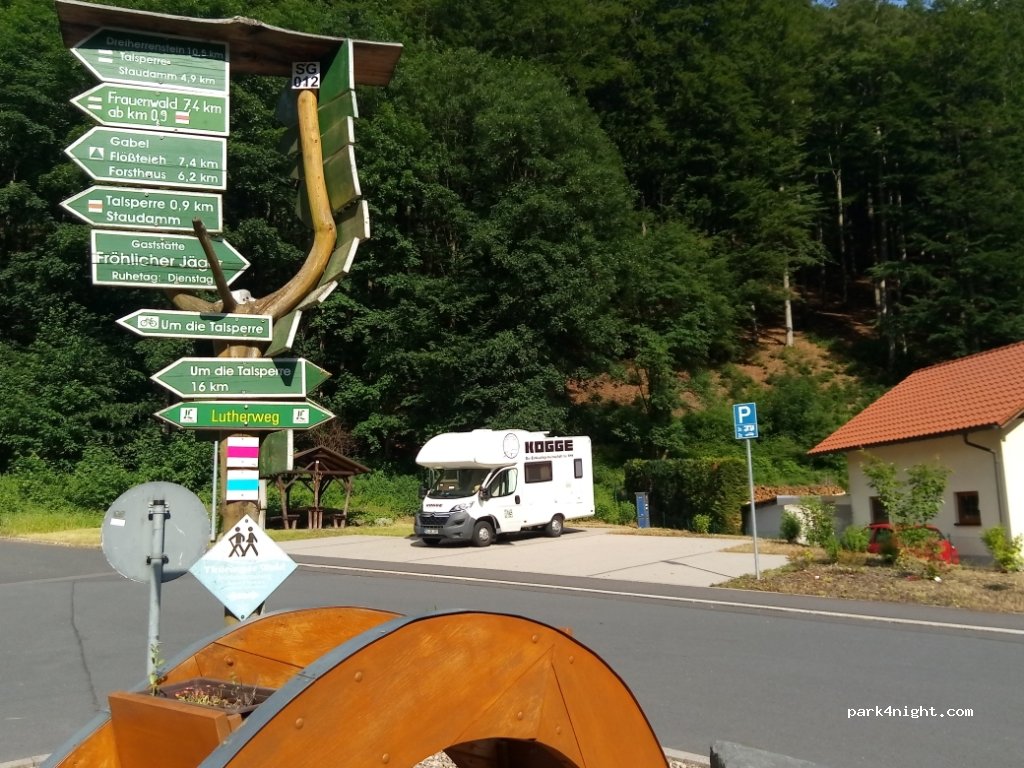 Kleiner Wohnmobil Stellplatz mit Platz für 2 große Wohnmobile und zwei in Campingbus-Größe. Sitzgruppe und Stromanschluss vorhanden. Gelegen am Ortsrand, Zugang zum Weg um die Talsperre. Keile nötig.