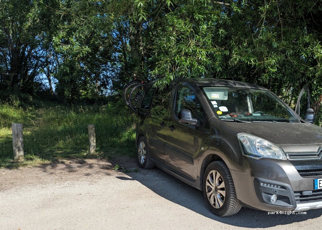 Parking ombragé en bord de route, qui est assez passante en journée mais sympa pour une nuit étape !