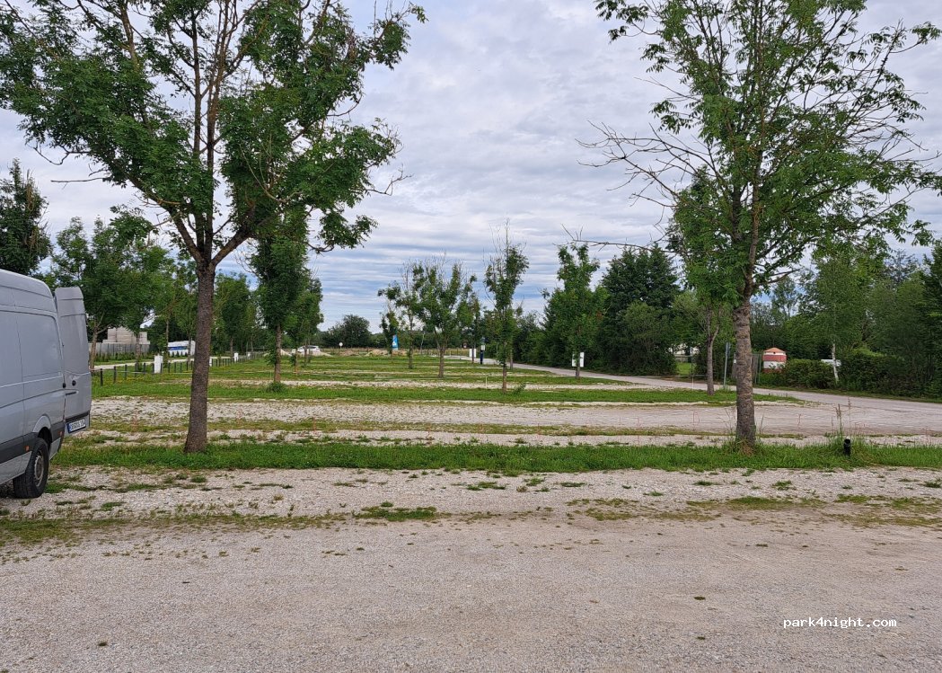 Good night here. Went for a late night swimming for 1.5euro each with the family. Only one other van joined us. Massive carpark so good space. Came on a sunny Sunday evening and found space but earlier would have been hard. There are 2 areas. One by the road and has a fair few ant hills but is away from the cement works or closer to the lake but next to the cement place. I think either is good.