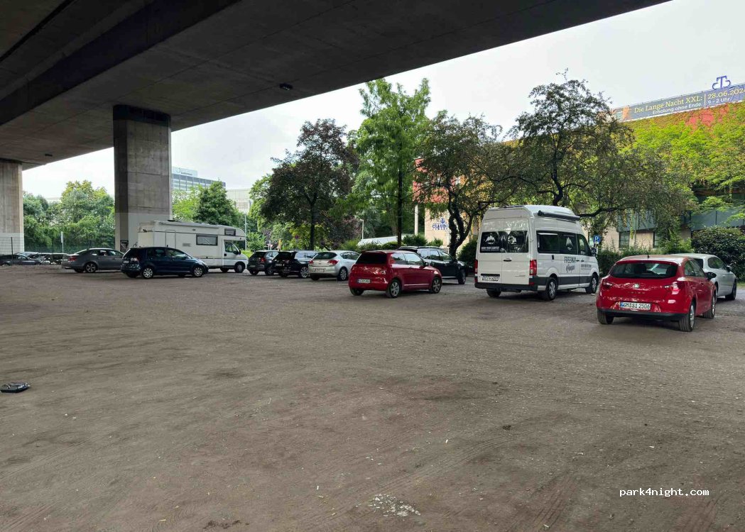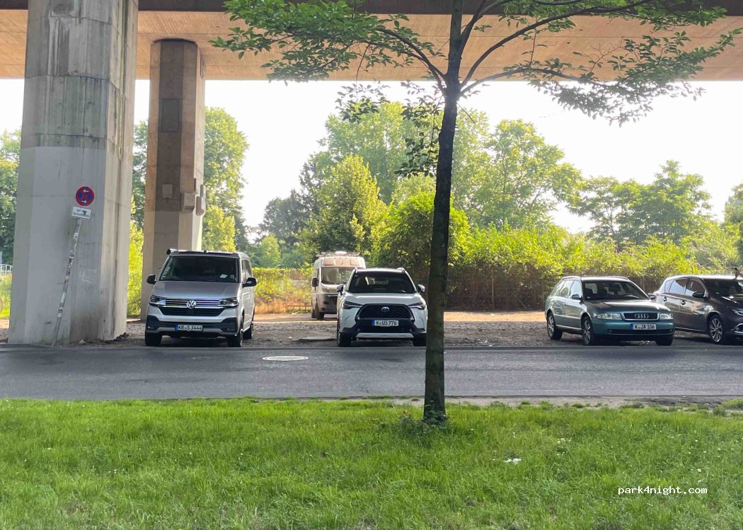 Free parking under the Zoobrücke bridge. Enough space for small or large campers. Close to Rhein Park and waterfront with playgrounds, relaxing spaces, and public toilets. Directly across the street from the Claudius Therme. 30 min walk to city center. Buses, trams, and cable car also nearby. Great location to stay to explore Cologne!