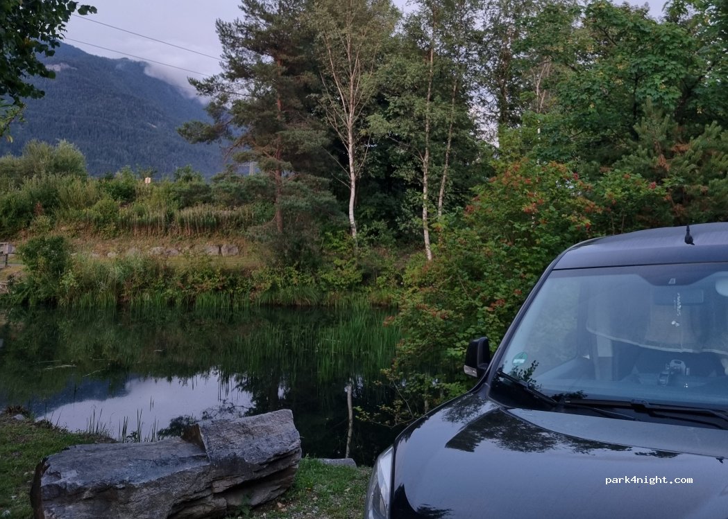 Wurde oben am markierten Platz "nett" darauf aufmerksam gemacht, dass man hier nicht parken darf. Ich habe mich dann unten an den Teich gestellt, wunderschöne Natur, Aussicht auf den Teich, die Berge und ohne das Verbotsschild zu überfahren. Baden im Fluss ist herrlich erfrischend!