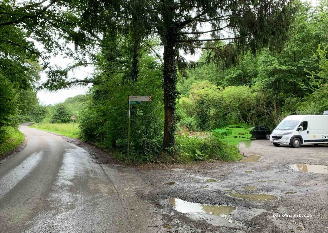 Kleiner Wanderparkplatz an einer schmalen Straße, die dennoch gut befahrbar ist für Fahrzeuge bis 7m länge. Tagsüber passiert regelmäßig Verkehr, sodass es nicht besonders ruhig ist. Dafür ist die Internetverbindung gut, z. B. Für mobiles Arbeiten. Guter Ausgangspunkt für reichlich Wanderwege durch den hügeligen Wald.