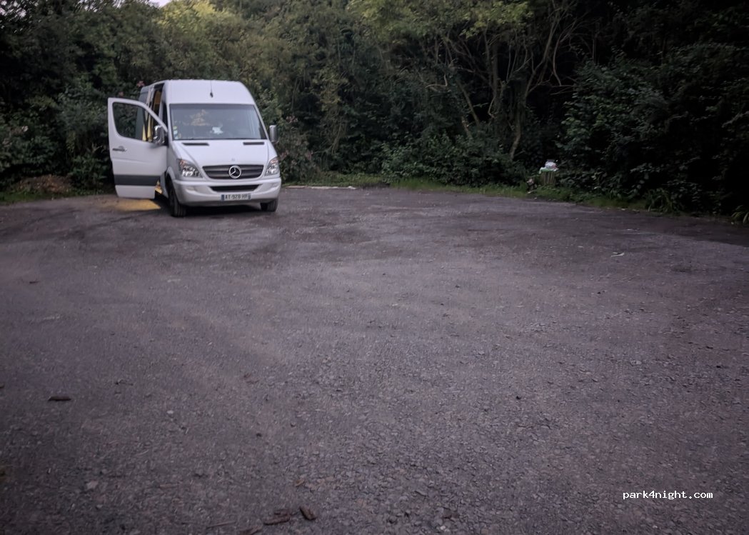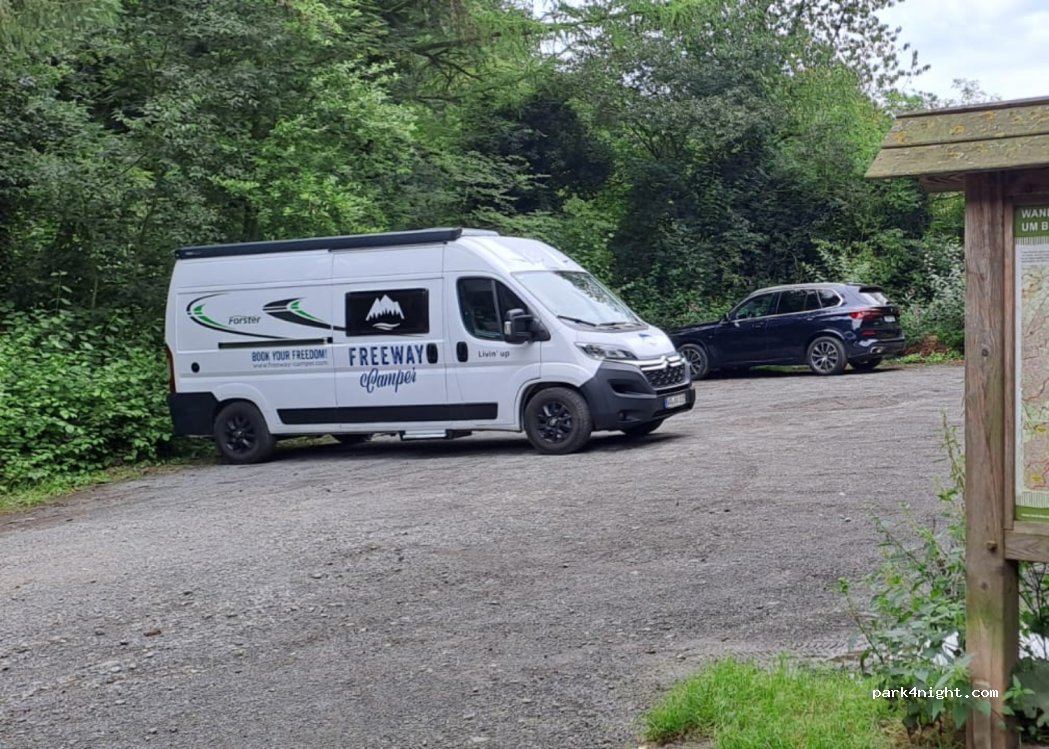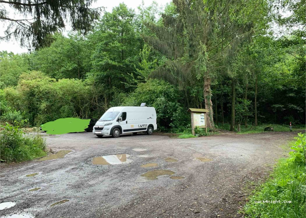 Petit parking de randonnée dans une rue étroite mais néanmoins facilement accessible pour les véhicules jusqu'à 7 m de long. La circulation est régulière pendant la journée, ce n'est donc pas particulièrement calme. La connexion Internet est bonne pour cela, par ex. B. Pour le travail mobile. Bon point de départ pour de nombreux sentiers de randonnée à travers la forêt vallonnée.