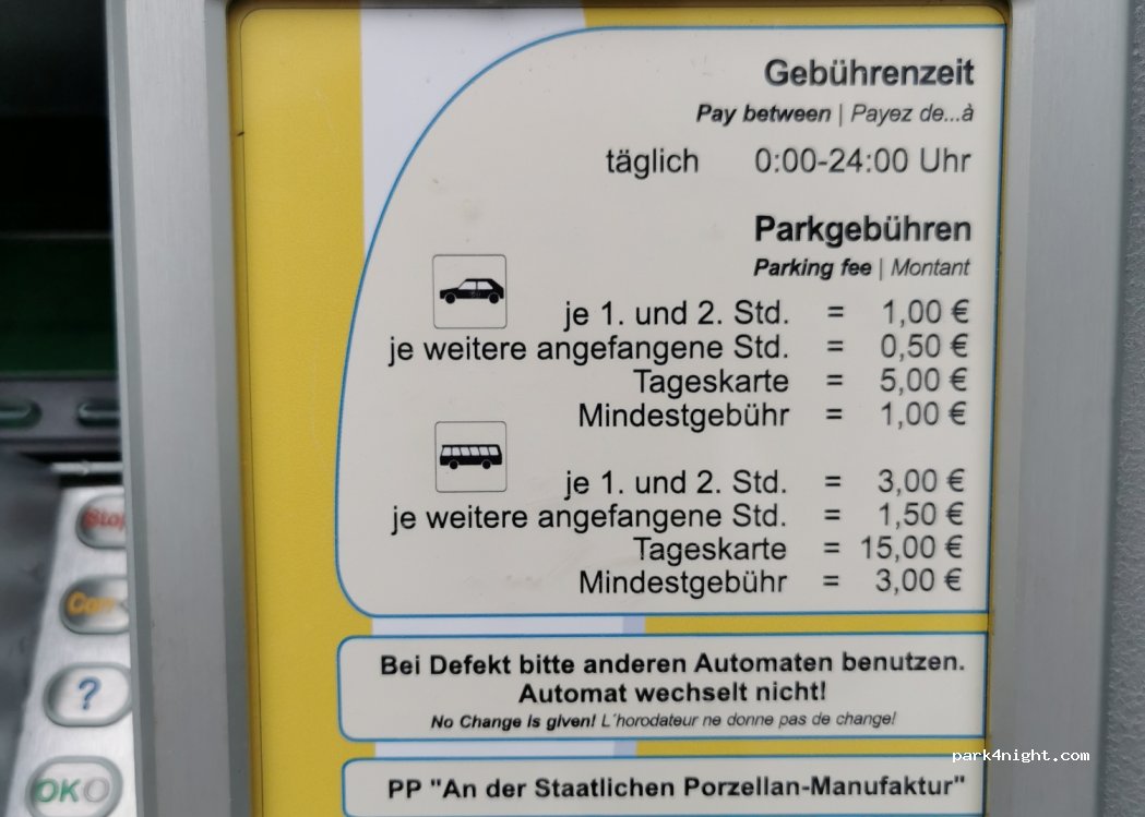 Duży i cichy parking 5€ za 24h czasem przejedzie kolej a rano biją dzwony ale za to do muzeum porcelany 5 min piechotą. Polecam