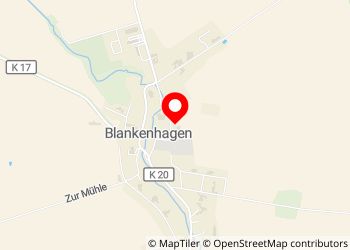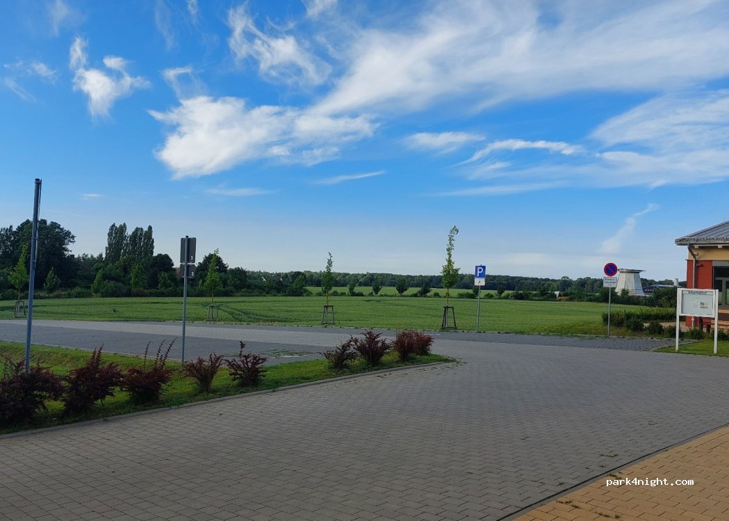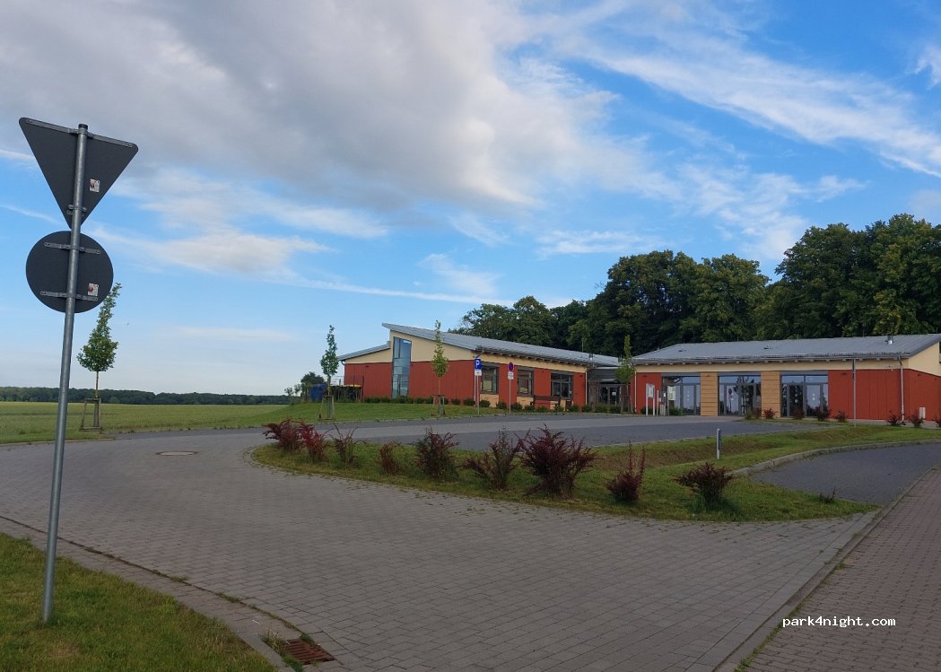 A parking lot in Blankenhagen with a view of a field. It is next to a community center, sports field and playground.