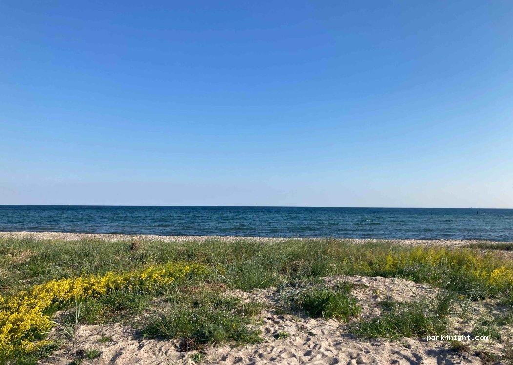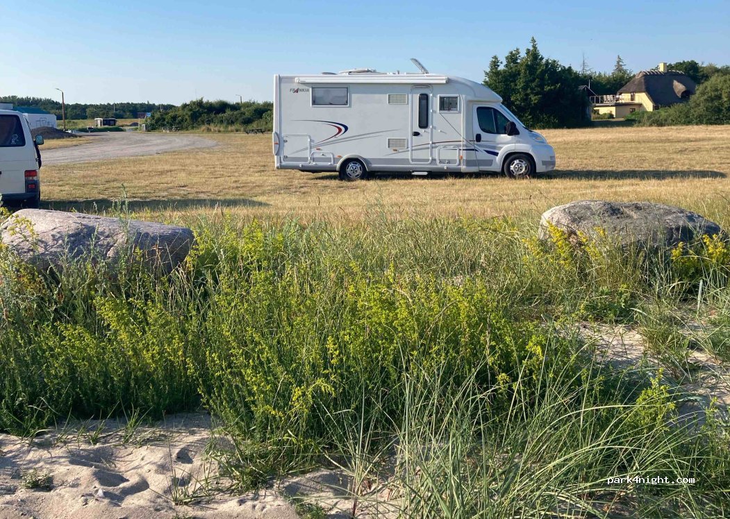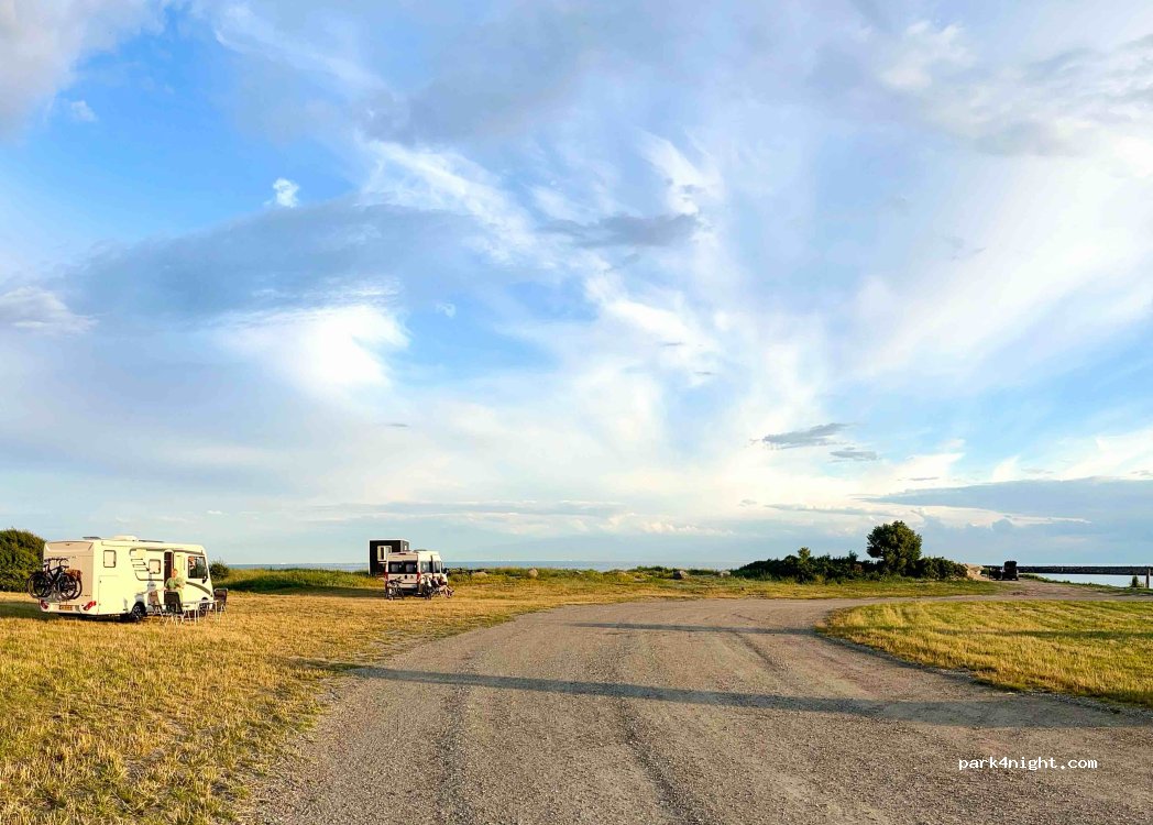 Excelente lugar muy tranquilo . Hay baños públicos no muy cuidados Pago mediante código QR A 15km del puerto del ferry desde Alemania con lo que es muy bueno si llegas en alguno de los del atardecer.