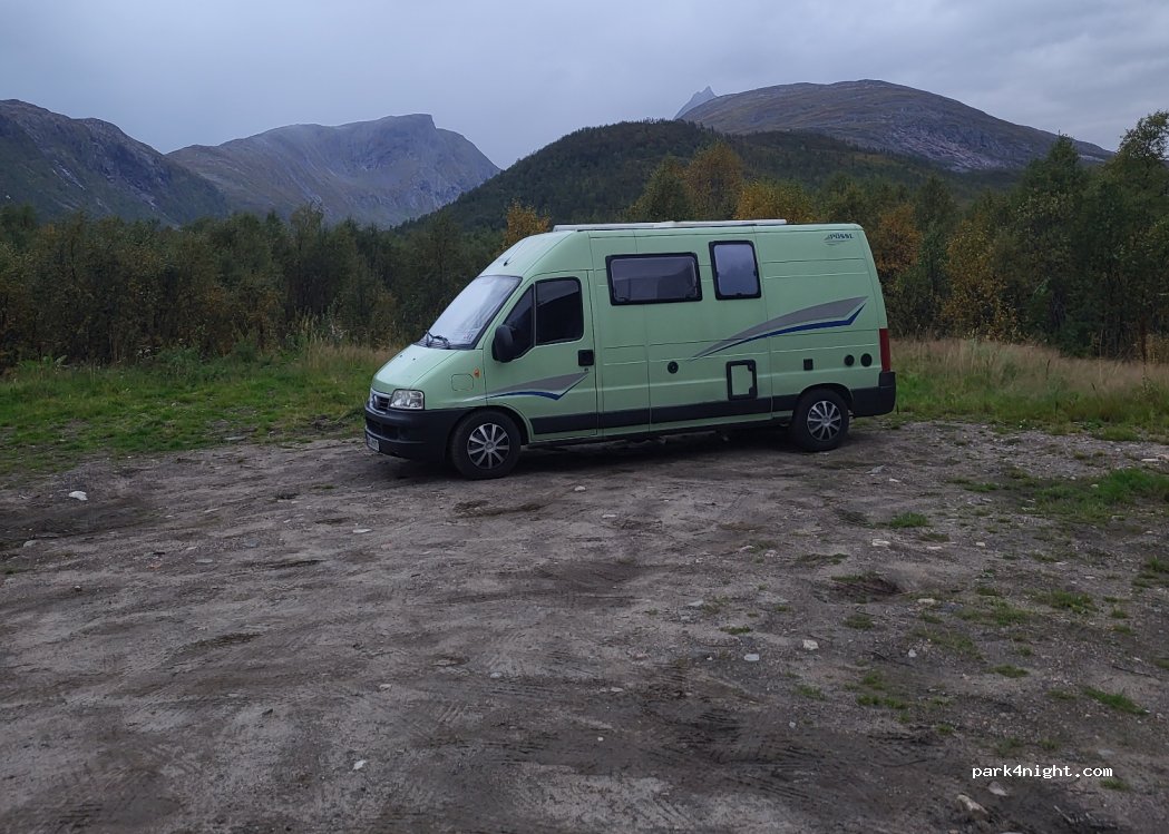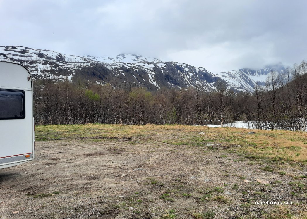 Großer Stellplatz abseits der Straße, sonnig und panoramisch. In der Nähe der Straße zur Fähre nach Tromsø