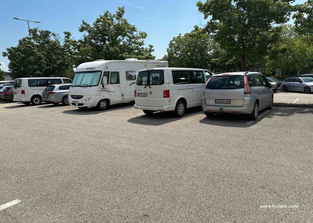 Parking plat et ombragé, vous pouvez vous garer sur une seule place, elle est partagée avec les voitures. Nous avons passé deux nuits, circulation de voiture le jour, très calme la nuit. C'est sous vidéosurveillance, les policiers sont passés plusieurs fois et ils n'ont rien dit. Il y a un Aldi à proximité.