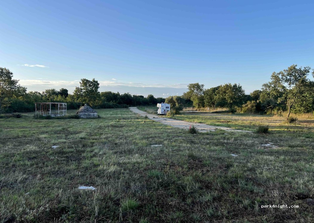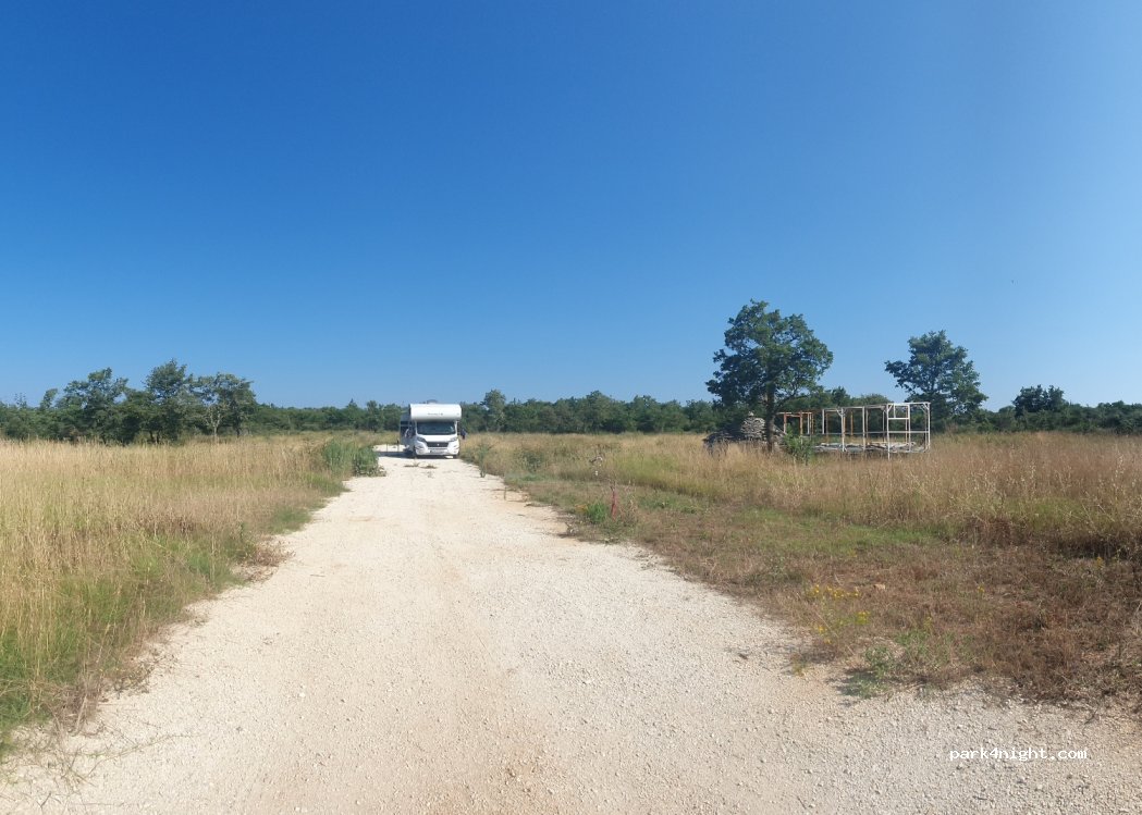 Quiet place at the end of the road. 100m wide meadow in the forrest. We stayed 1 night, with 6m camper. Access comfortable, turning easy. Noone around, nothing disturbing. Oh, yes, we heard a strange sound of dog / wolf / weird human once in the evening, :-) Not much to see or to do, just a quiet place to sleep. Access to sea and beaches is 1km from here. There is an old small rural building from stones and an old iron construction on the meadow.