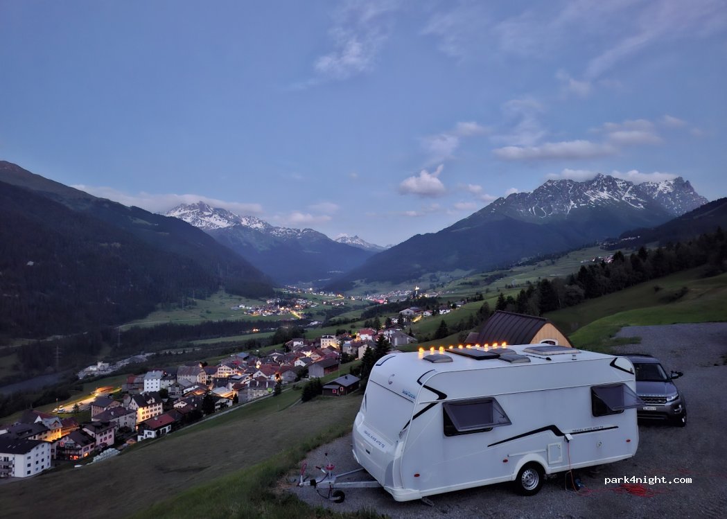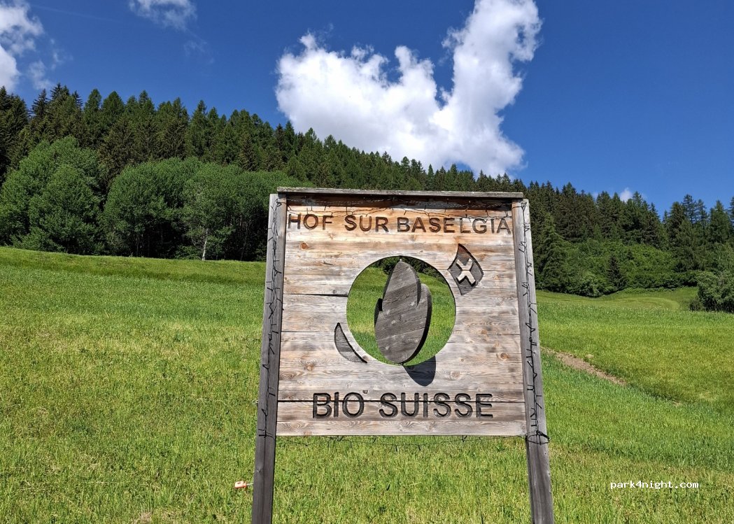 The view from this spot is incredible. Sandra is a very warm host. She tucked us into a truck space behind the cow sheds, looking out across the valley, and registered us for a guest card which gave us free access to the local gondola ride up the mountain. 27 CHF plus 2.70 each tourist tax. If your camper weighs more than 3.5 tonnes take the bigger access road from town avoiding the wooden bridge.