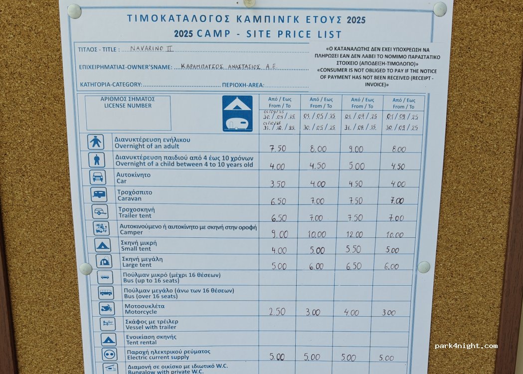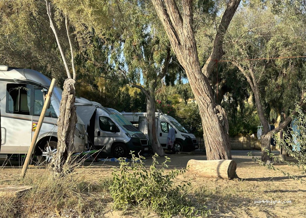 Camping direttamente sulla spiaggia, mare bellissimo. Campeggio con tutti i servizi, bagni recenti e puliti, piazzole ampie e ombreggiate. Città di Navarino a 5 km. Fine aprile due adulti e camper E 24,00 meglio avere bici o moto per raggiungere le spiagge più lontane o la città. Lo consiglio.
