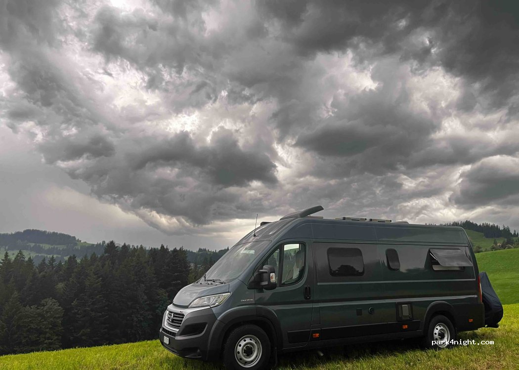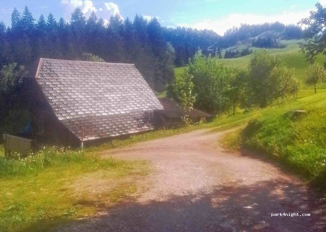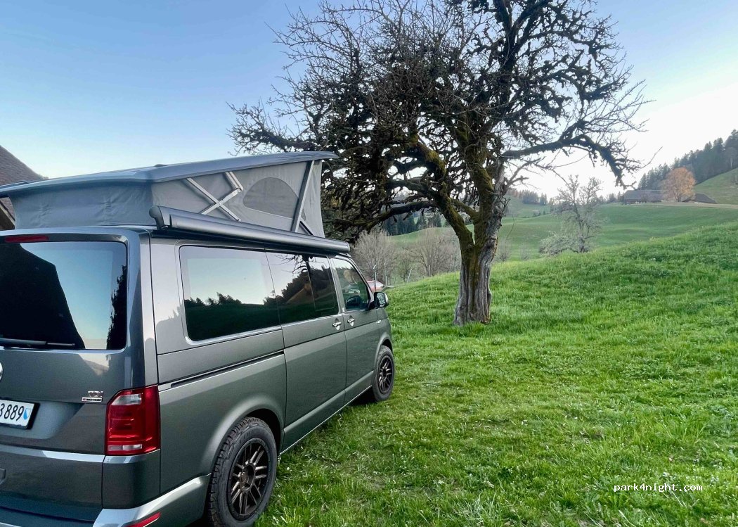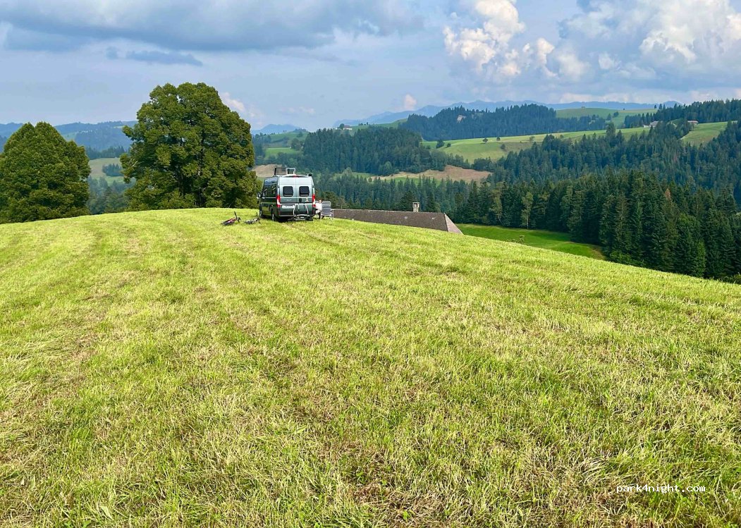 Wir konnten oberhalb des Hofes auf einer frisch gemähten Wiese stehen. Damit hatten wir eine traumhafte Aussicht. Es gibt im Wohnhaus ein neues WC mit Dusche zur Benützung. Wenn der Standort auf dieser Wiese nicht möglich ist, muss mit Keilen die Geländeneigung beim Wohnhaus/Scheune ausgeglichen werden.