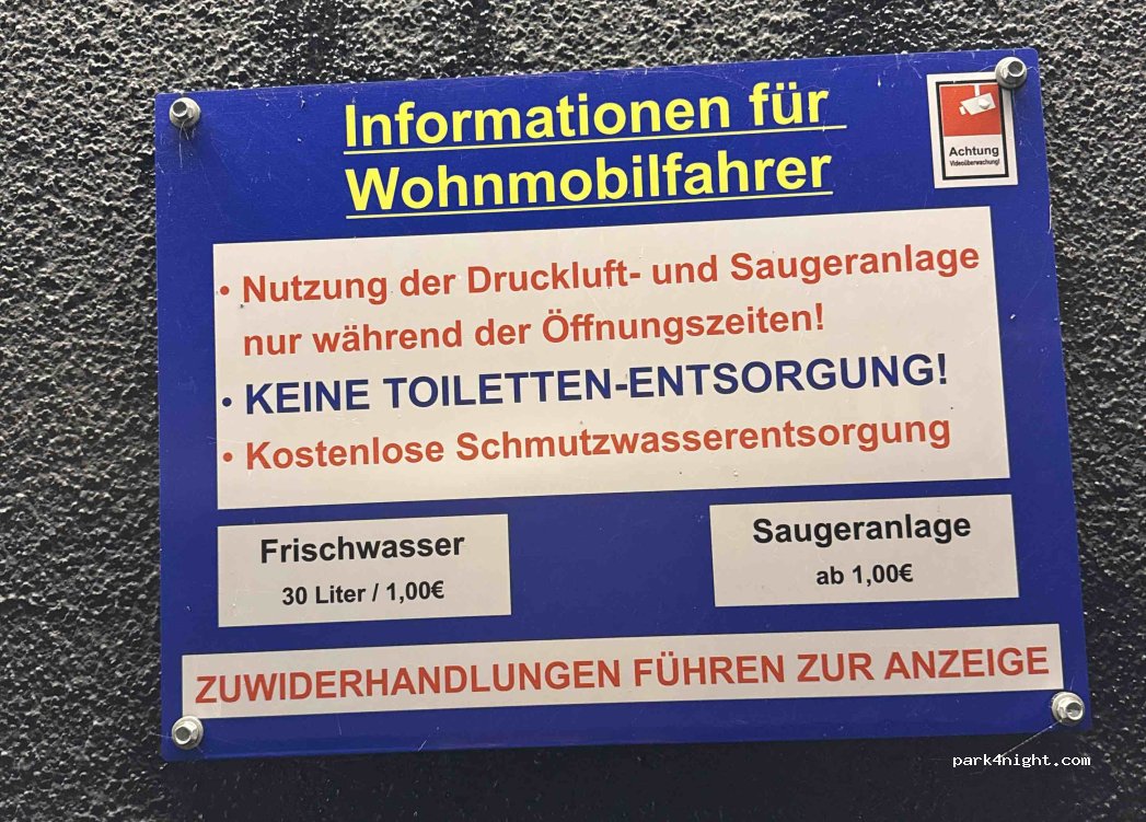 Hier kann man Super Grauwasser kostenlos entsorgen. Frischwasser ist mit 1€für 30 Liter seht Teuer. Toilette entsorgen geht nicht.
