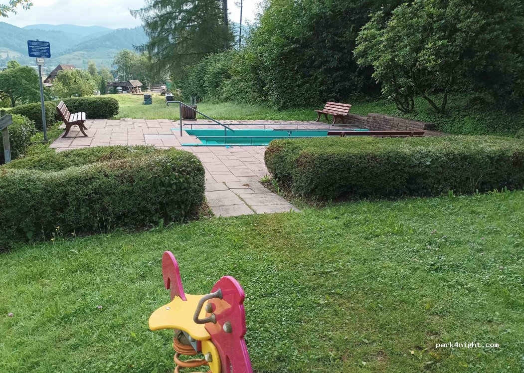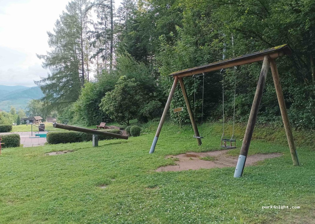 Very close to Gengenbach. About 10 seats, next to a very little-traveled mountain road. Next to the bisque with a stream. Next to a children's playground with a covered wooden area (porch type) to chat, eat, play in case of rain. There is a small swimming pool to cool off that is part of the playground (about 50 cm deep). Very quiet place to spend the night, adjacent to a small town. Alternative to spend the night and then go visit Gengenbach