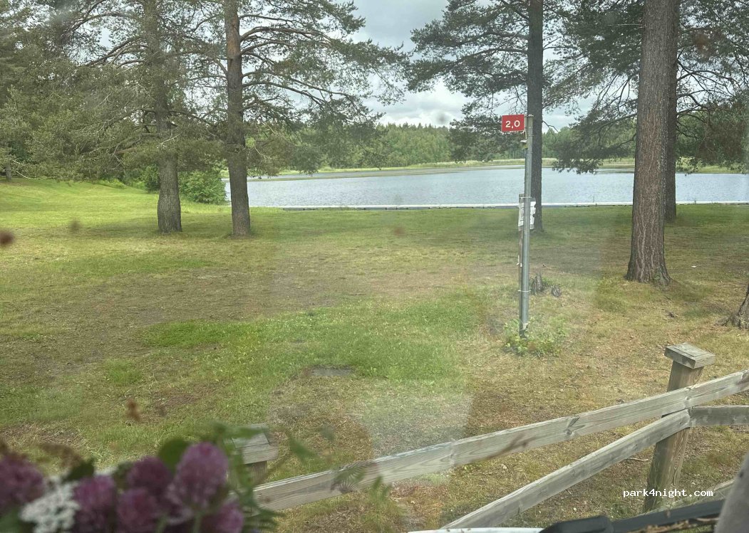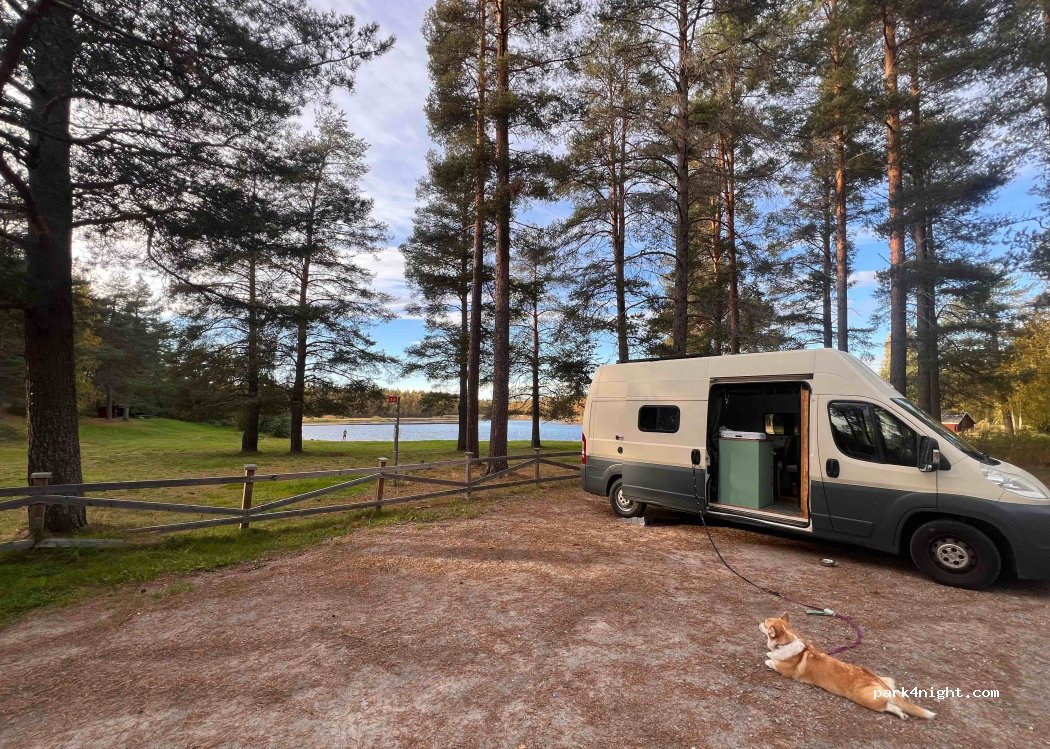 Parking assez grand pour plusieurs véhicules mais restant intimiste car entouré d’arbres. Vue sur le lac, pas d’autres véhicules que nous ce soir la. En revanche, au petit matin, route qui devient plus passante dès 6h. Toilettes fermées. Poubelles présentes.