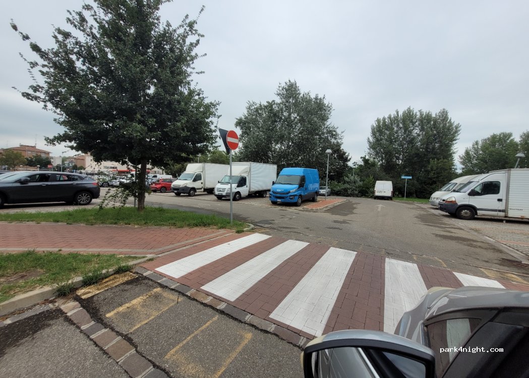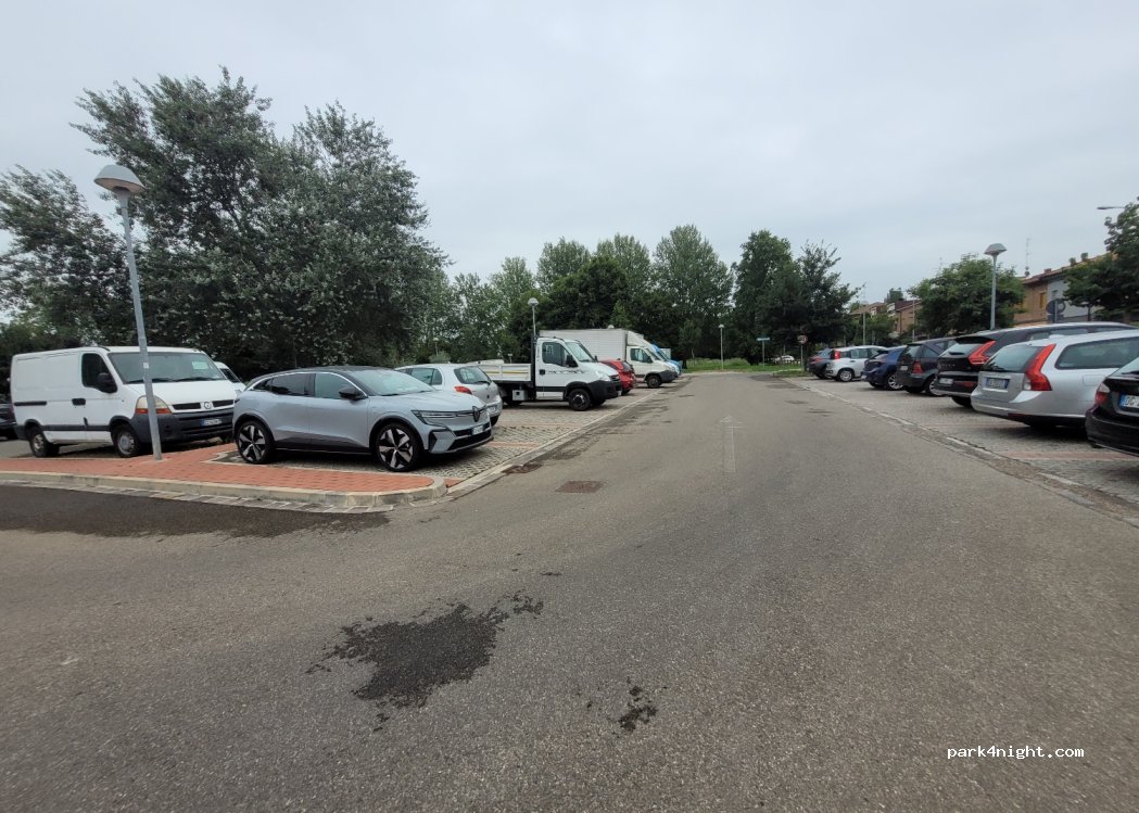 Petit parking urbain dans un quartier animé mais calme avec un grand supermarché Coop adjacent et la pizzeria Delfino en face. Il fait partie d'un grand espace vert avec une aire de jeux pour chiens et une aire de jeux pour enfants. De là, la piste cyclable commence vers le nord en direction de Fossoli di Carpi. Il y a souvent des camping-cars, certains garés toute l'année par les résidents.