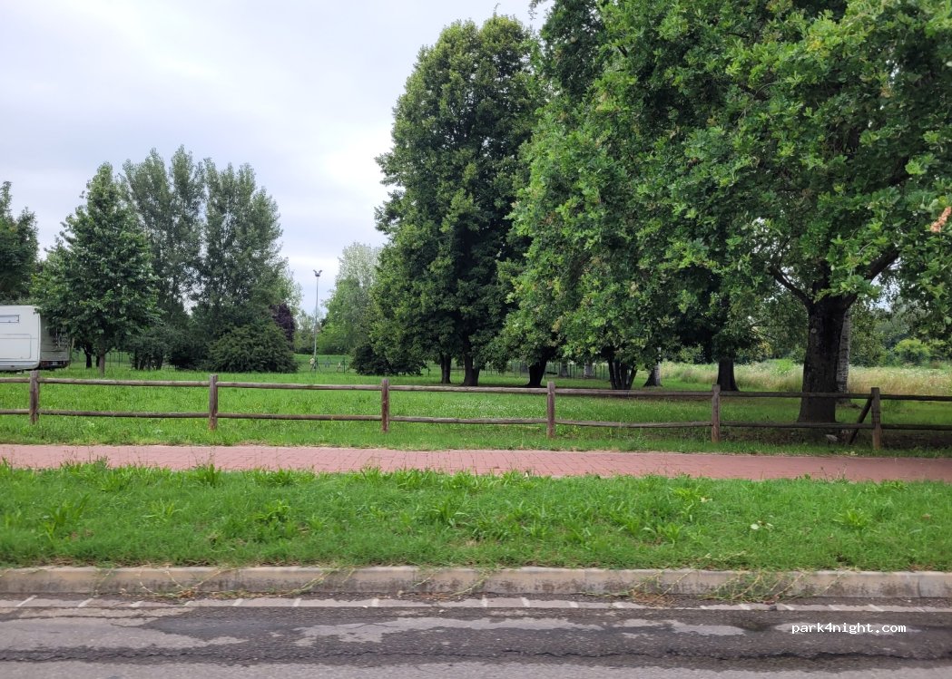 Small urban car park in a busy but quiet area with a large Coop supermarket adjacent and the Delfino pizzeria opposite. It is part of a large green area with a dog run and a children's playground. From there the cycle path starts north towards Fossoli di Carpi. There are often campers, some parked year-round by residents