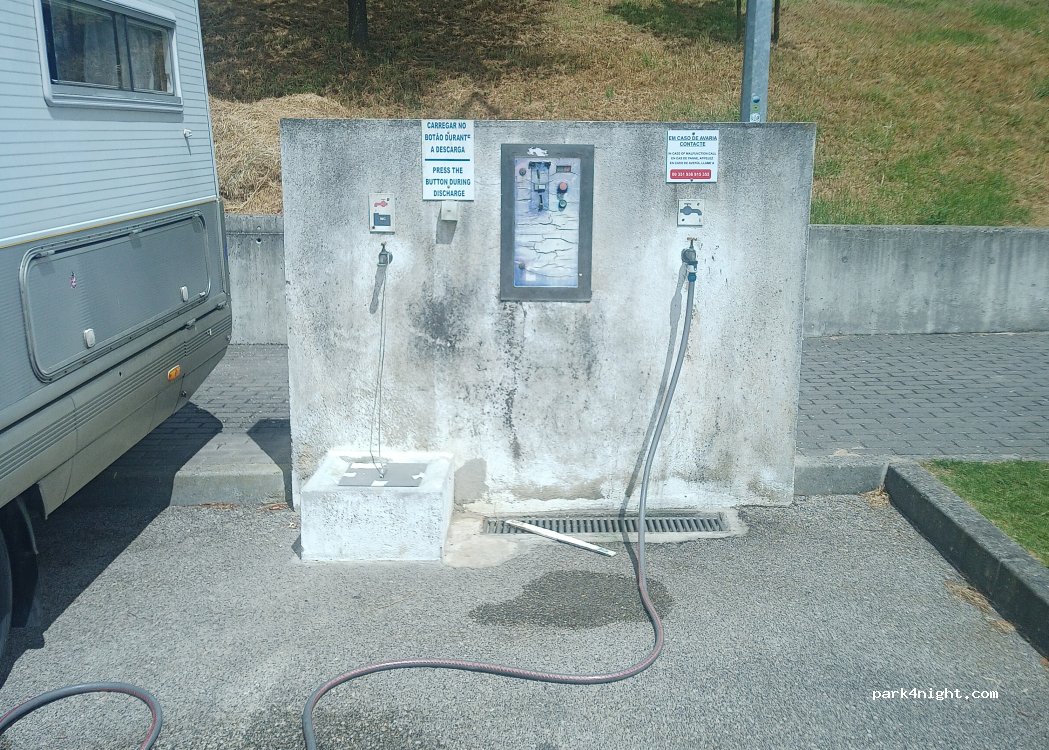 Superbe aire de services, tout est à disposition et même l'électricité gratuite, des prises au sol et sur une borne. Parking très propre, tranquille, proche de tout, il y a 7 places bien larges, du jamais vu merci à la ville de Mafra. 2 € pour environ 50 à 60 l d'eau propre ou sinon il y a l'Intermarché qui est juste à côté 2 € les 100 litres et des machines pour laver et sécher son linge.