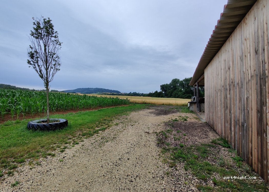 Ruhiger, kleiner Stellplatz hinter einer Maschinenhalle etwas außerhalb des Ortes.