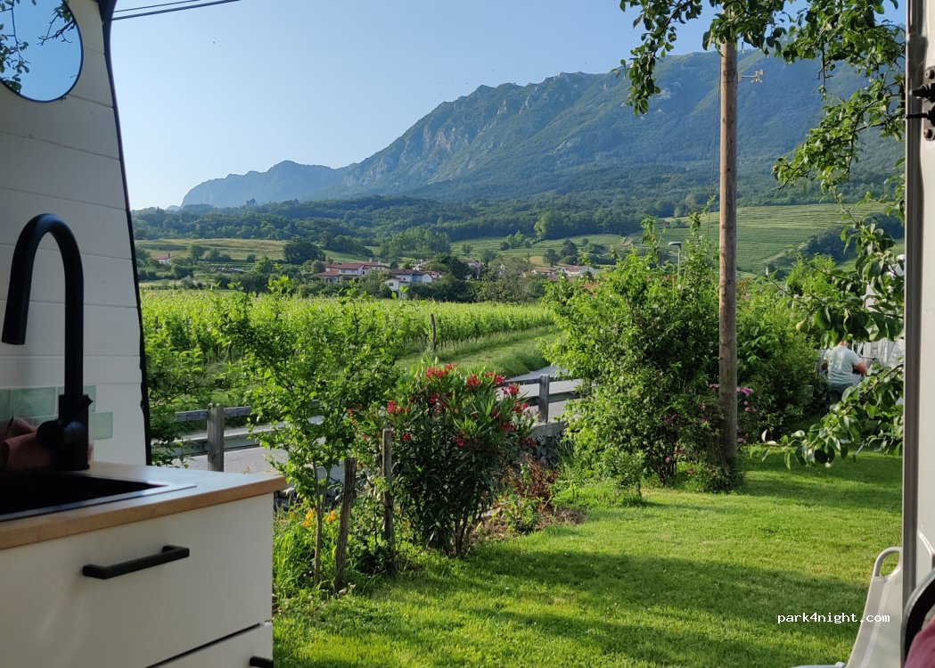 Leuke kleinschalige camping met vrije staanplaatsen in de tuin. Uitzicht over de wijnvelden. Sanitair is vrij nieuw en schoon, goede douche. Eigenaar erg vriendelijk en gastvrij, ontvangst met eigen gemaakte wijn. Goed restaurant (en wijnproeverij) in Vipava, ongeveer 25min lopen. Enige minpunt is de kerkklok die tussen 7uur en 21uur elk kwartier slaat. Prijs voor 1 nacht met stroom €28