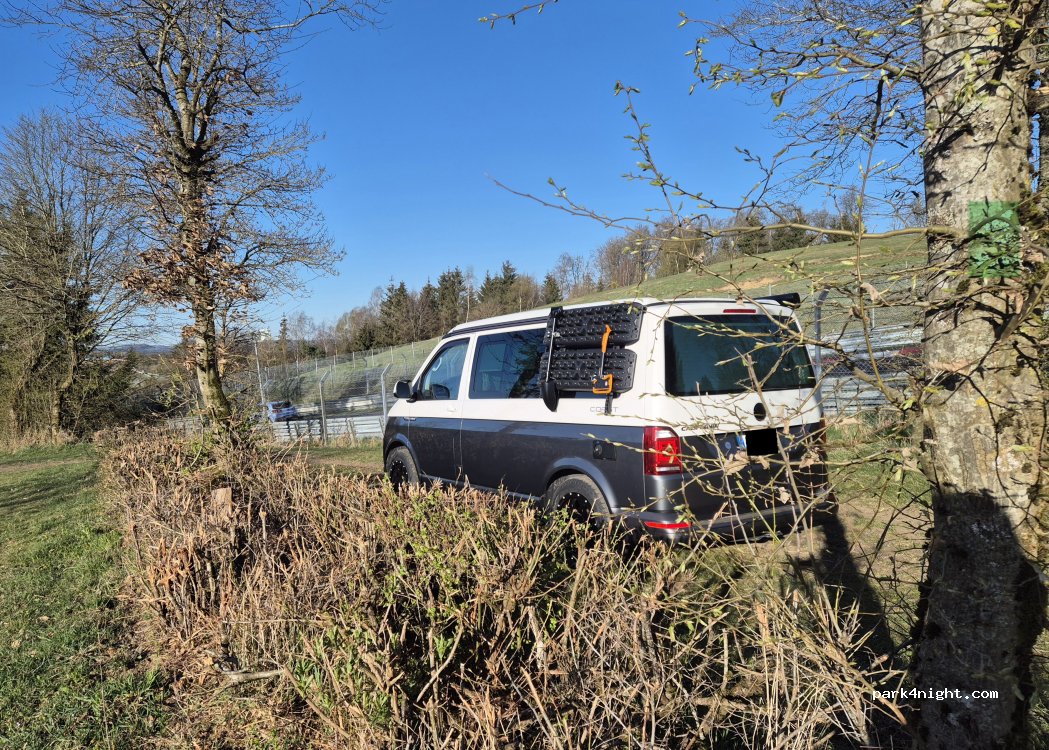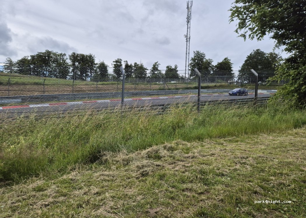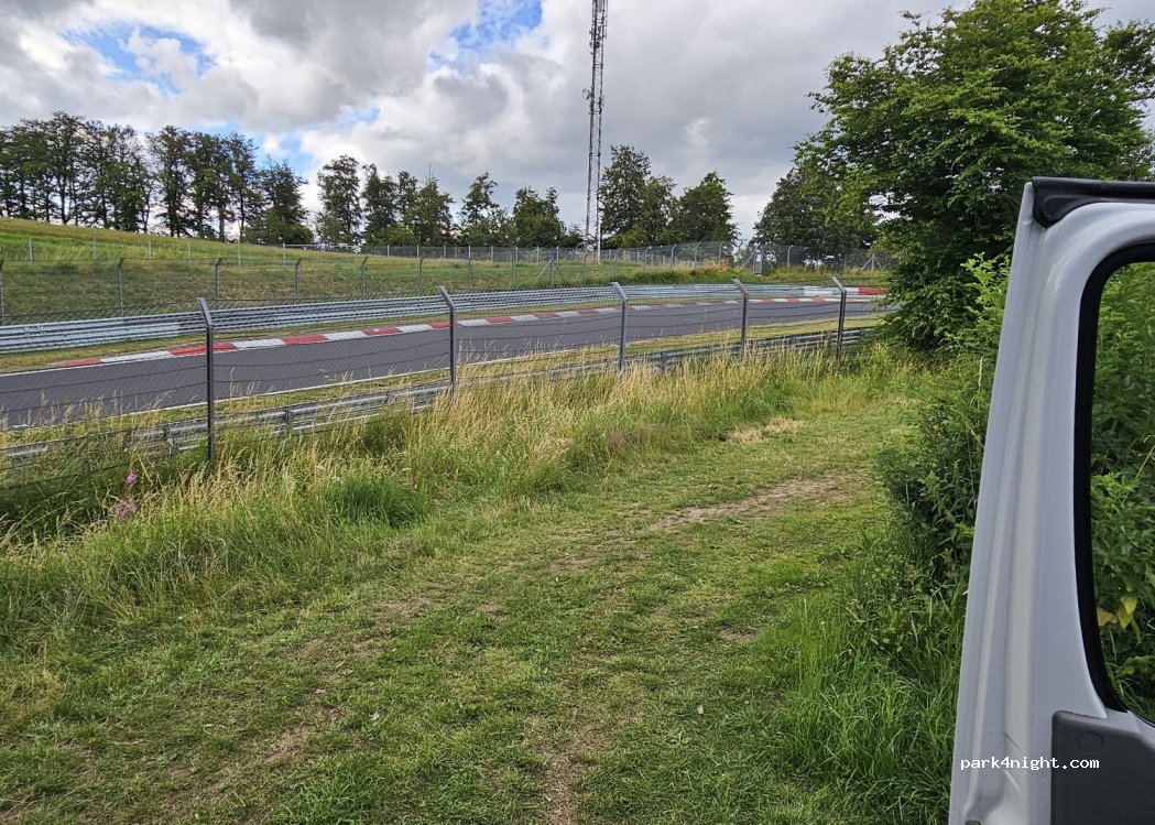 Parking for cars at the Nürburgring with a view of the race track. The lawn was mown when we were there. No barrier at the entrance.