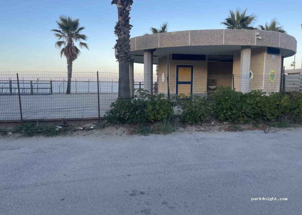 Parking assez grand très calme, éclairé, nous avons passer une nuit dans notre van, à côté d’un autre van , il y a une grande plage, douche et toilette fermées hors saison , chemin de fer pas trop loin