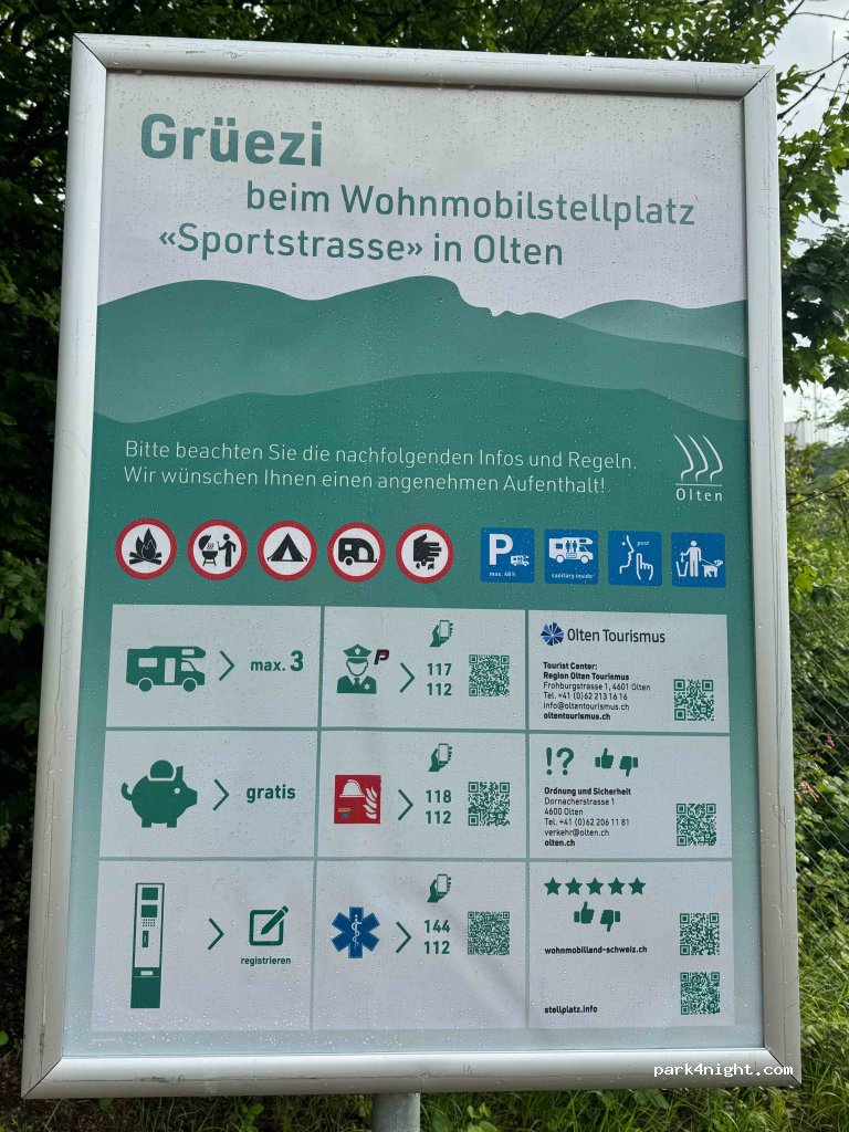 Kostenloser Stellplatz der Stadt Olten. Gut erreichbar, sauber und sicher. Nur für autarke Camper. Morgens an der Zufahrtstraße etwas Berufsverkehr. ca 100m eine öffentliche saubere Toilette.