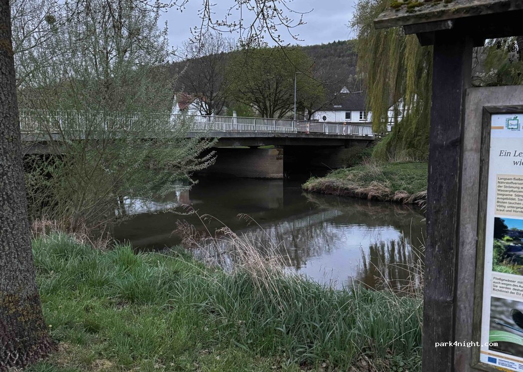 Emplacements près de NetheBrücke pour cinq camping-cars, directement à côté de l'eau. L'endroit est en gravier. A Bruchhausen, il y a un centre-ville historique avec des maisons à colombages