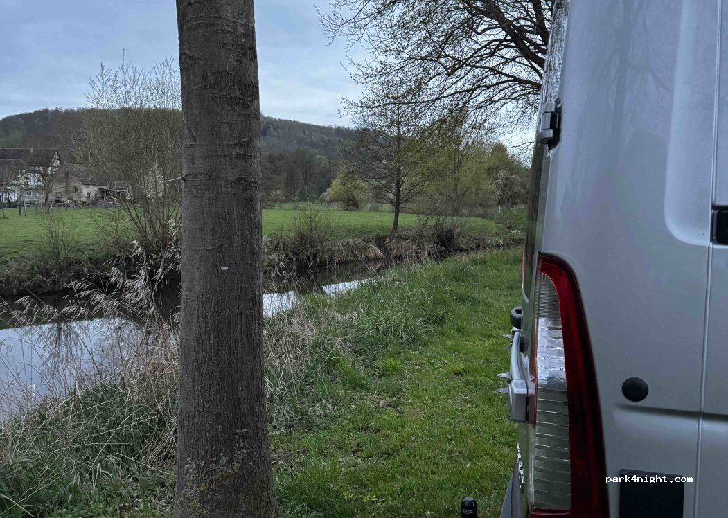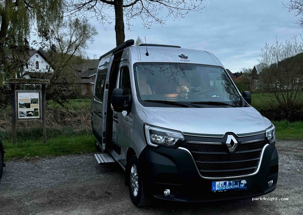 Für eine spontane Übernachtung sehr schön gelegen. Hauptstraße ist kaum befahren und störte mich nicht. Mit dem Hund ist man sofort den Feldweg runter in der Natur. Morgens aufgewacht lagen Informationen an der Windschutzscheibe über die Gegend und den Ort sowie das Angebot vom örtlichen Bäcker.