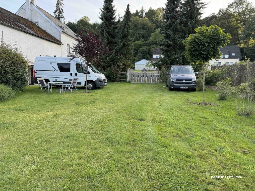 Schöne kleine Wiese mit 3 Plätzen. Es gibt eine gute Toilettenanlage, die direkt zugänglich ist, Wasser und Strom (Achtung Adapter notwendig von Schuko auf CEE). Das große Gelände, wo auch Gäste aus den Ferienzimmern sind, kann genutzt werden (schöner Hof mit Riesen-Kastanie sowie Hühner und ein Schwein). Bezahlen via QR-Code möglich. Danke für alles.