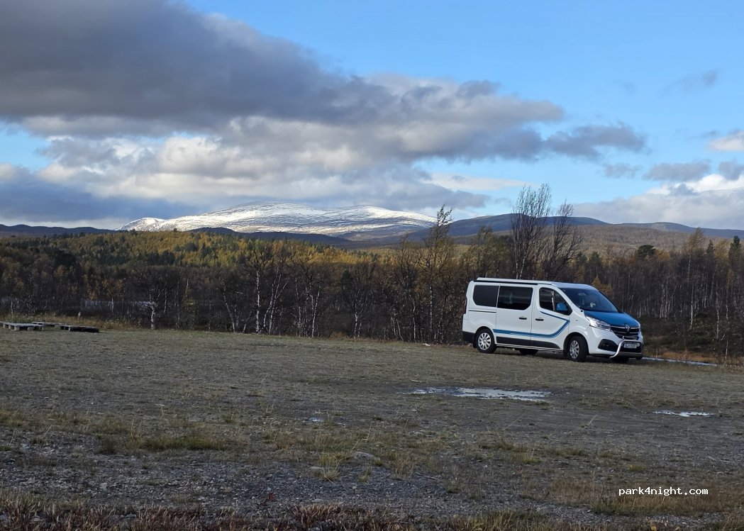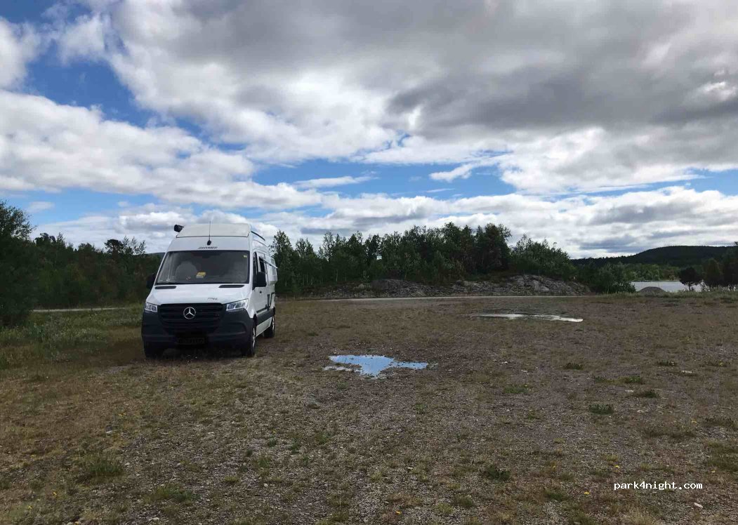 Flat overnight spot at the transition from Lake Tatjaktjajávrre to Lake Luoktak. A few meters before the bridge on the left on the small tarmac road there is a larger gravel spot. Out of sight of the holiday homes, almost no traffic, absolute peace at night. The only thing you can hear is the small river between the two lakes.