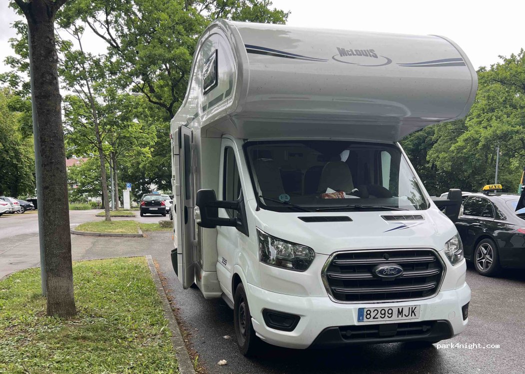 Es un parking con algo de desnivel (2-3%) con una piscina pública cerca con opciones para niños a 10 minutos a pie del museo Porsche y un Aldi.