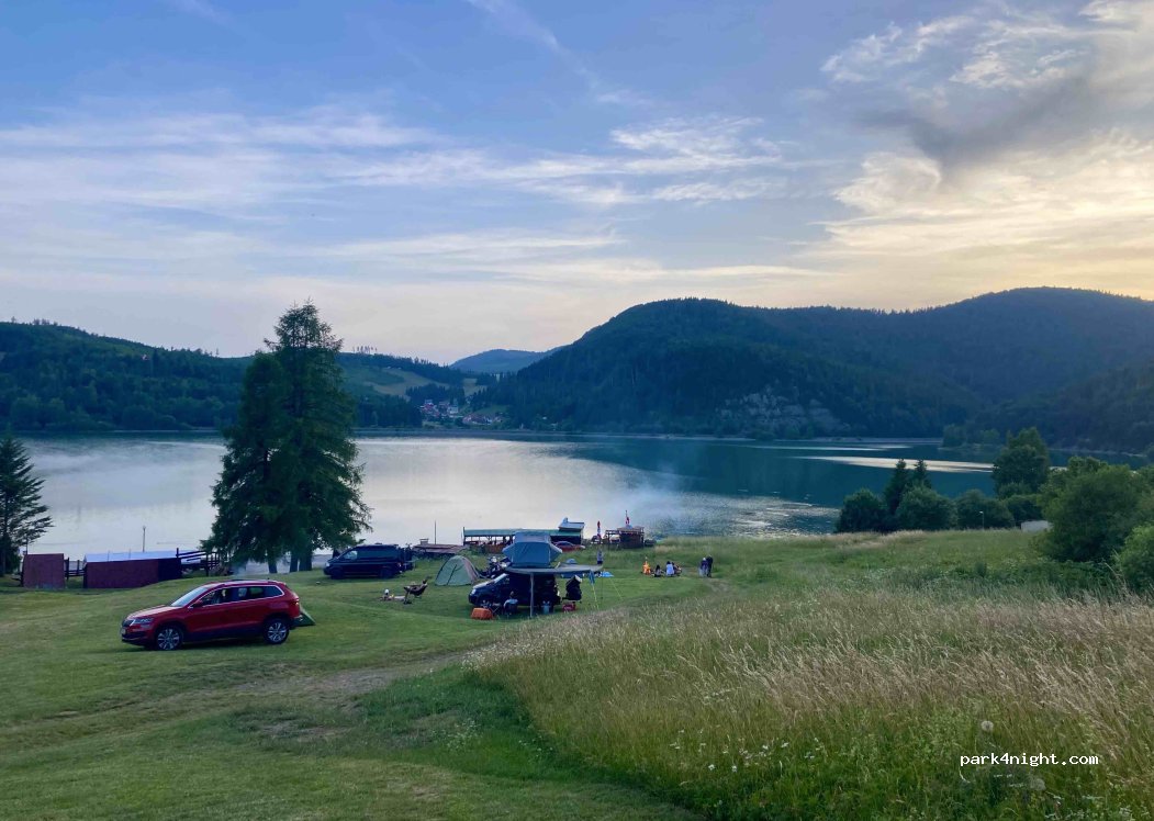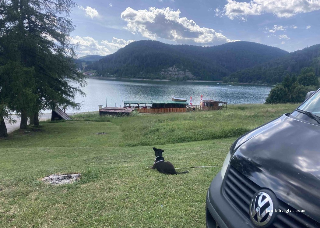 Plutôt un terrain exploité que vraiment un camping. Accès en effet pas évident pour les campings car. Au pied d’une petite remontée, derrière des resto / hôtel / parking. Pas mal de circulation donc. Route en contrebas. Terrain pentu avec wc et douches. À côté du lac pour baignade. 13€ pour un petit van et une personne. Registration at the hotel.