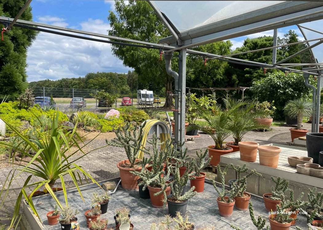 Kundenparkplatz beim „Kakteenland“. Auch große Wohnmobile können hier parken. Zum Verkaufsbereich gehört ein Café mit Toiletten.