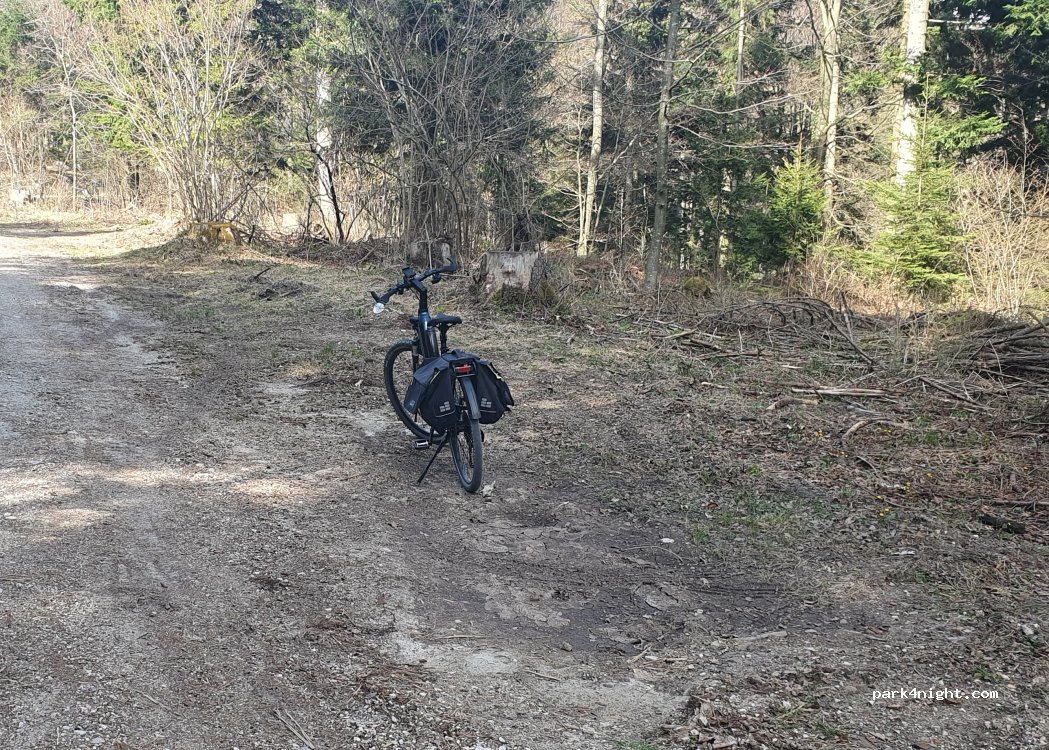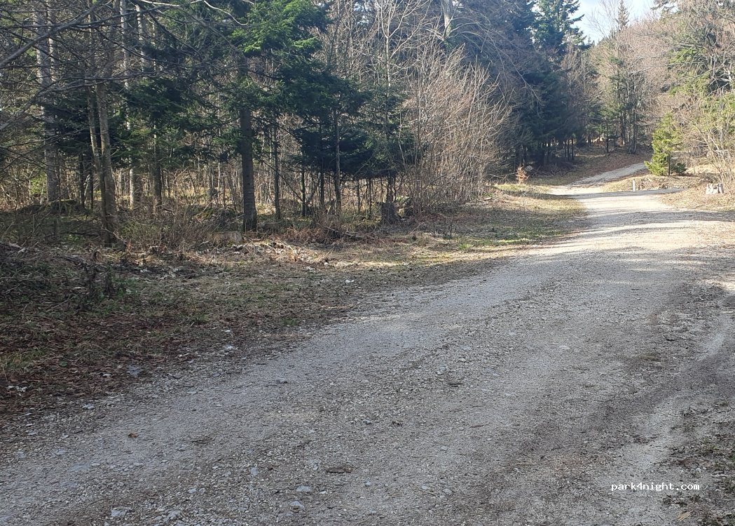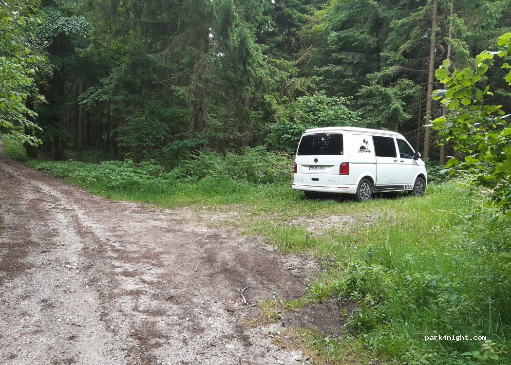 Verlassen Sie die Straße und nehmen Sie rechts einen Waldweg. 2 Stellplätze, flach, für Van, links, mitten im Wald. Ruhig versichert.