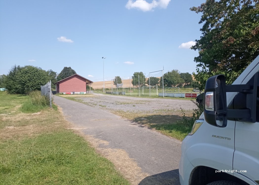 Neben einem Fussballplatz in der Nähe eines kleinen Flusses ( Nethe). Untergrund: Kiess und Asphalt. Auch für grosse Wohnmobile geeignet. Guter Zugang von der Bundesstrasse.