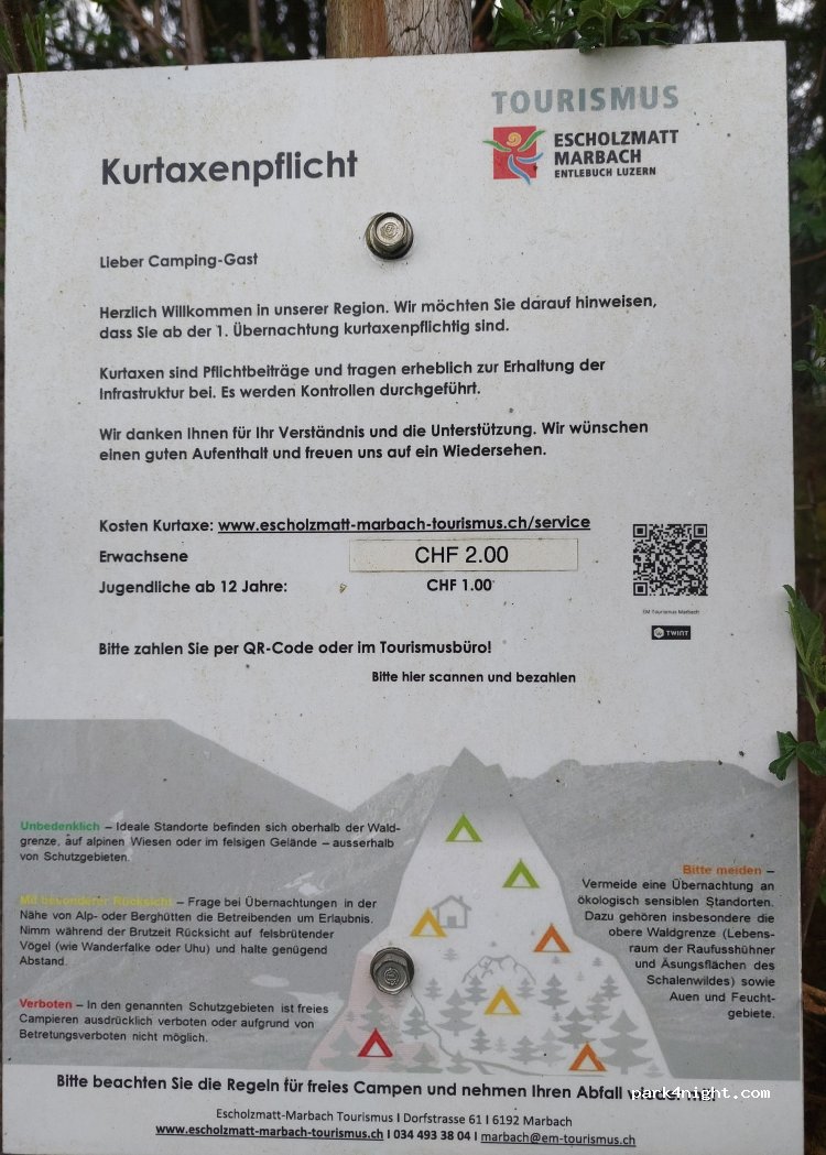 Nous avons passé une bonne nuit, taxe de séjour 2.- adulte et 1.- enfant. Endroit incroyable, îlot de forêt avec tables, foyer pour griller, toilette sèche et bois à disposition. Près d’une route peu fréquentée en pleine nature. Merci à la commune pour ce bel endroit.
