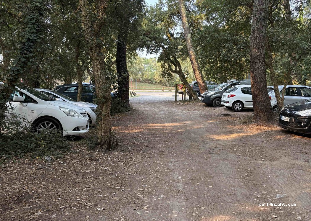 Good space but can get busy . Bins there but nothing else. Beach is a 10 minute walk with great sunsets . Police municipale turned up but were friendly just told me I could only stay maximum of 2 nights. Make sure to keep it tidy and take all your litter with you .