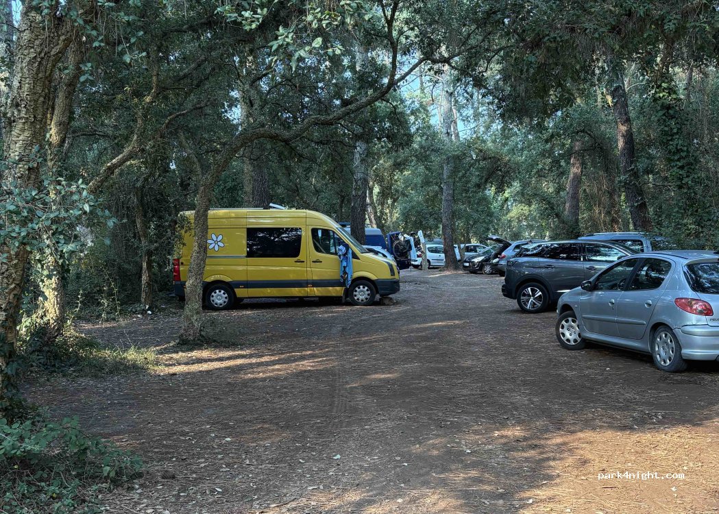 an okay place, considering it's pretty hard to wild camp in the area. I could find a spot with my hymer (6,9m long). a very beautiful 7min drive with the bike to the beach, through the forest. getting out was tricky since a lot of people park their cars there. best to arrive very early or after 9pm. no problems with the police, locals were very friendly.