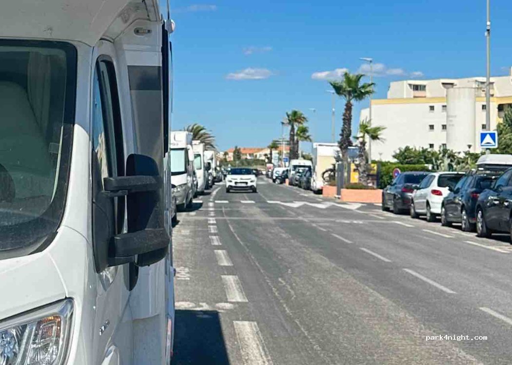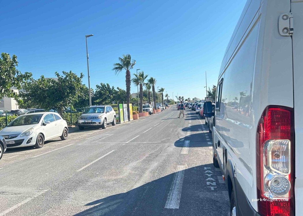 Wir haben unser knapp 7 Meter langes Wohnmobil zusammen mit anderen großen Wohnmobilen am Straßenrand abgestellt. Man kann aber auch länger parken. Der Parkautomat spricht deutsch :-) Bar- oder Kartenzahlung möglich. Zum Strand sind es 4 Minuten zu Fuß. Duschmöglichkeiten waren leider nicht zu finden.