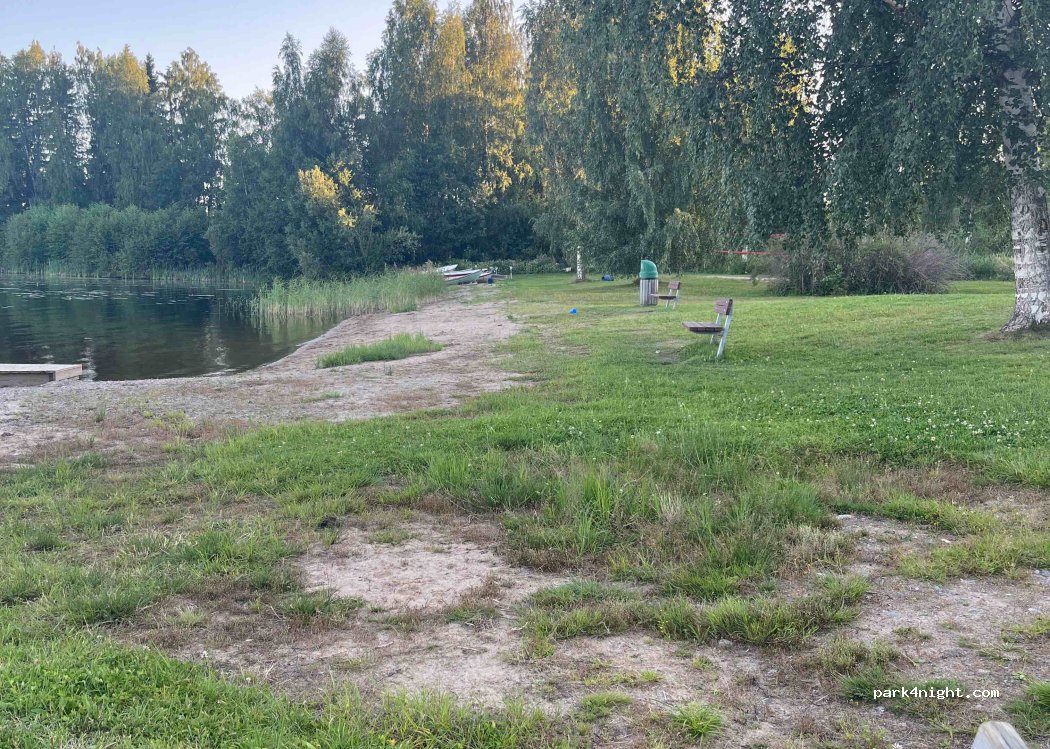 Schöner Badestrand mit Picknickbereich und Feuerstelle.