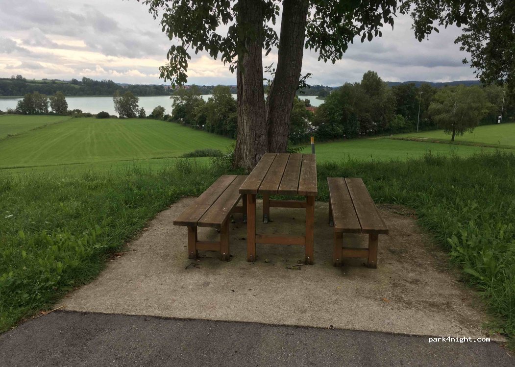 Belle aire de pique-nique avec des sièges et une vue magnifique sur le lac Taching. Juste à côté de la route, camping en vue