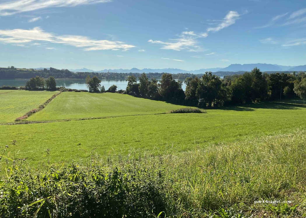 Schöner Picknickplatz mit Sitzgelegenheiten und toller Aussicht auf den Tachinger See. Direkt neben der Straße, Campingplatz in Sichtweite