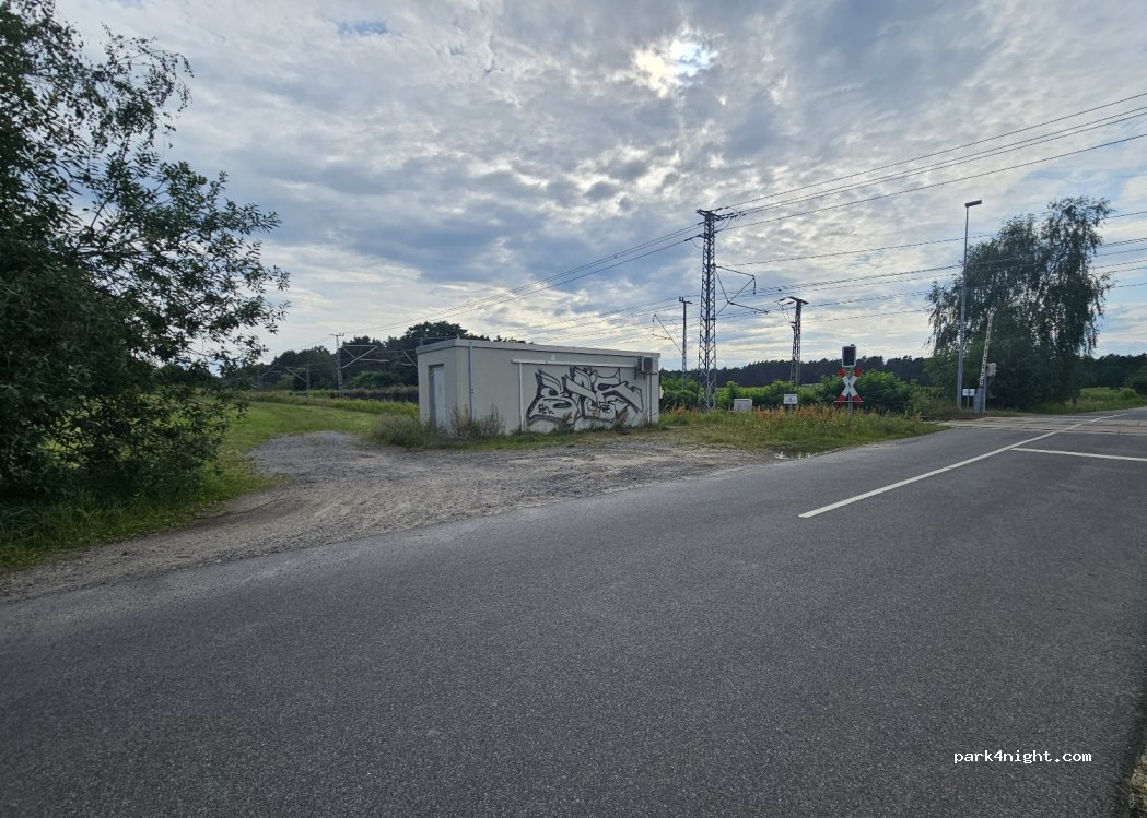 Schotterplatz an einer Bahntrasse in einer kleinen Ortschaft.
