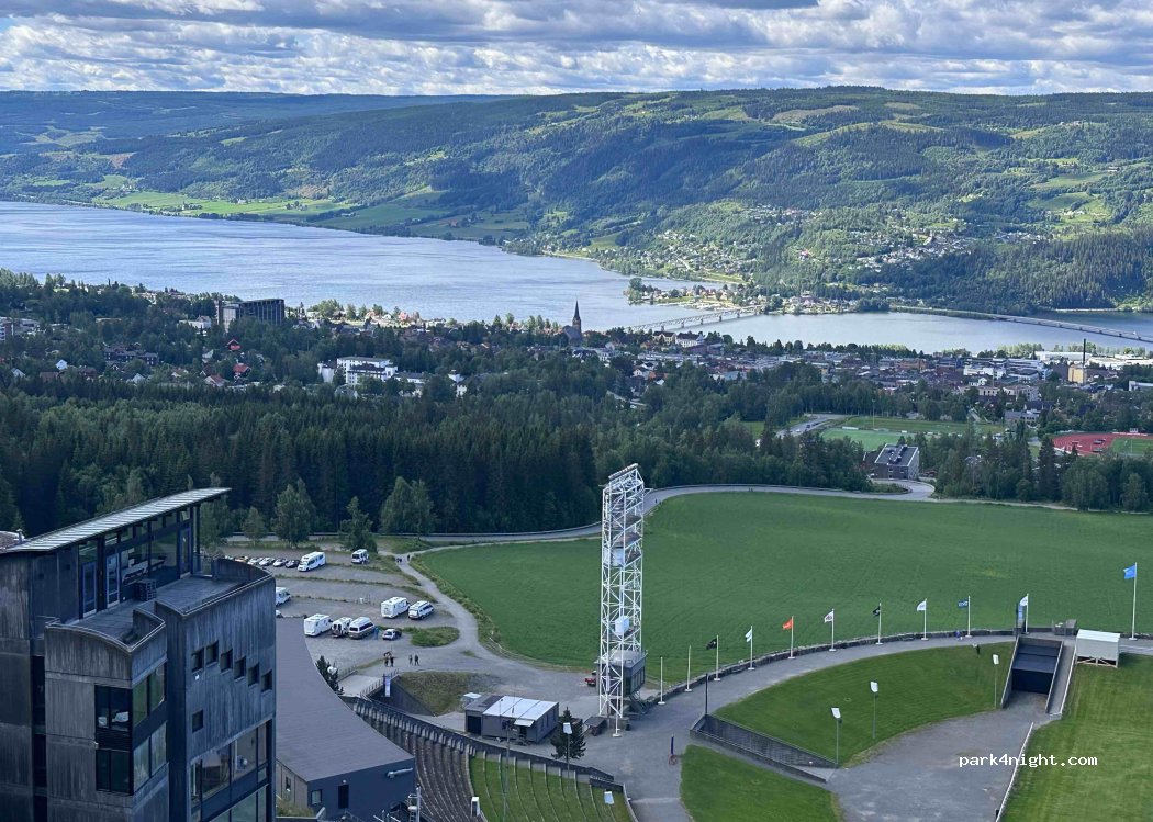 Super Parkplatz für 100 NOK 24 Std. Ticket mit spektakulärem Ausblick auf die Stadt Lillehammer und die Schanze. Echte Alternative zum mückenübersähten Ufer am See und dem übervollen Campingplatz. Müll und alles andere kann man im Anschluss an der Tankstelle in Lillehammer entsorgen. Einfach nur Top beim Essen die Springer aus dem Camper zu bestaunen!!!