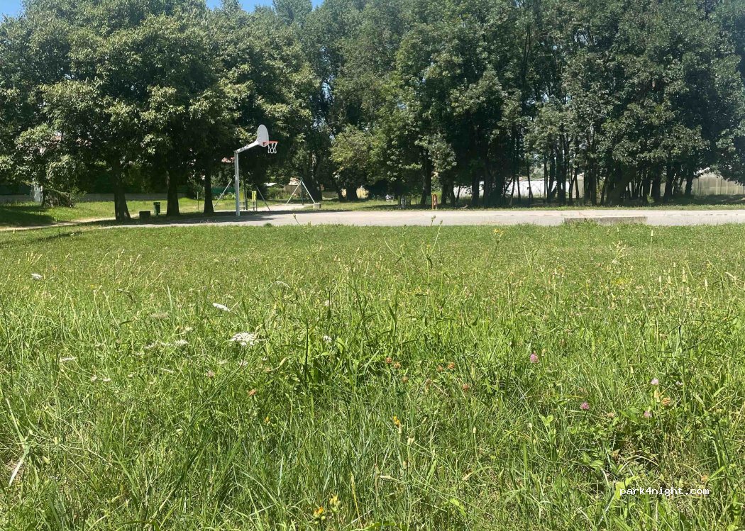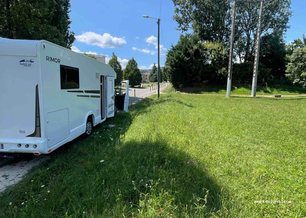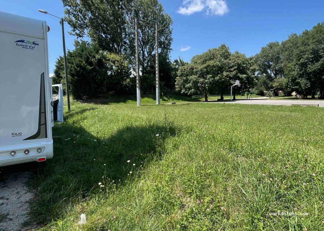 We parked on the side of the road to have a meal but I think we can stay there the night. Quiet location with a play area ideal for children
