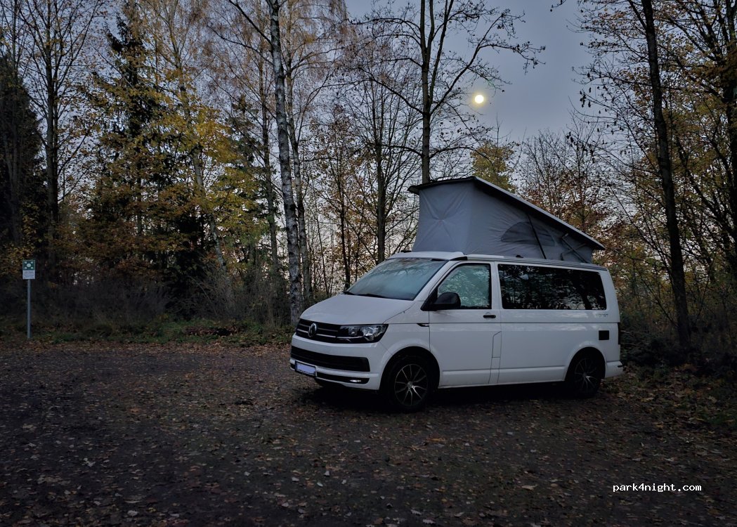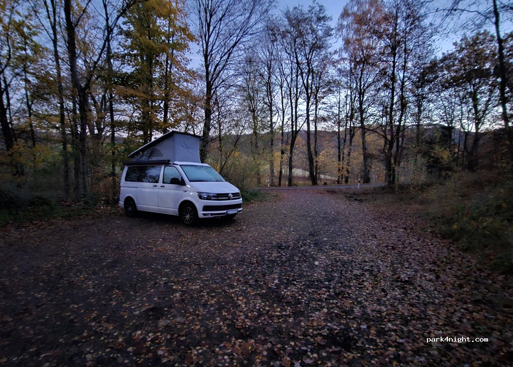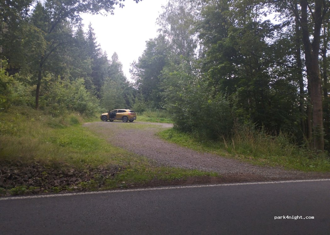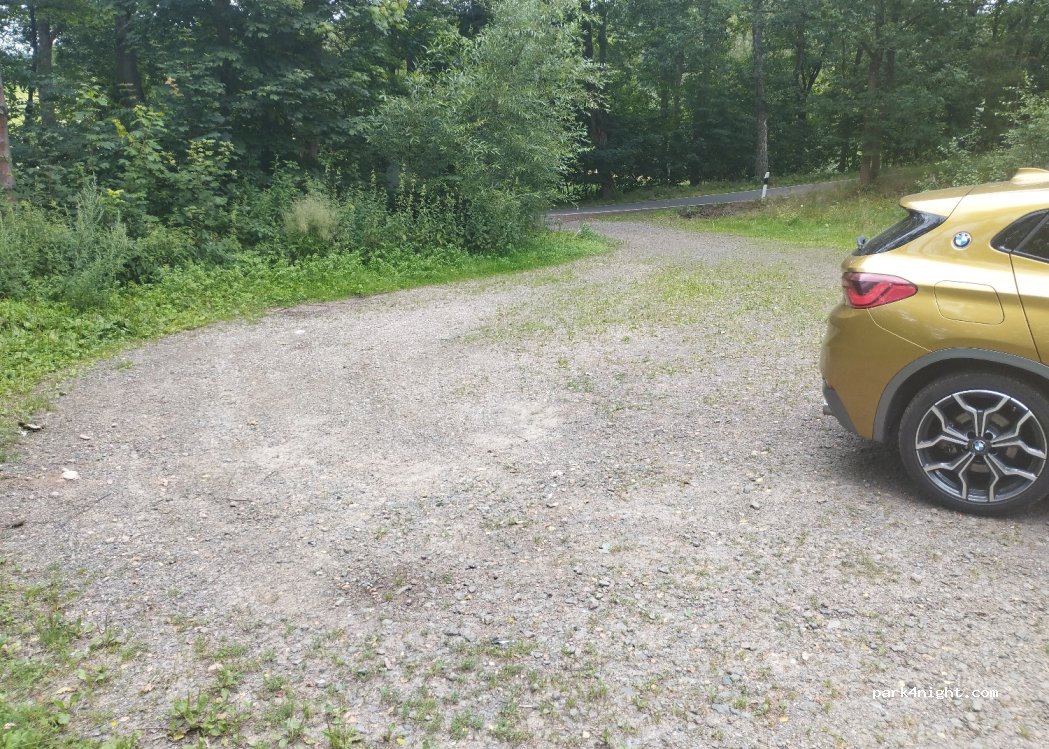 Parkplatz in umgeben von Bäumen ? im Wald aber auch sonnig 2reisemobile haben Platz locker . geschottert an einer wenig befahren Straße. abends nachts hört man nur Vögelein singen ?